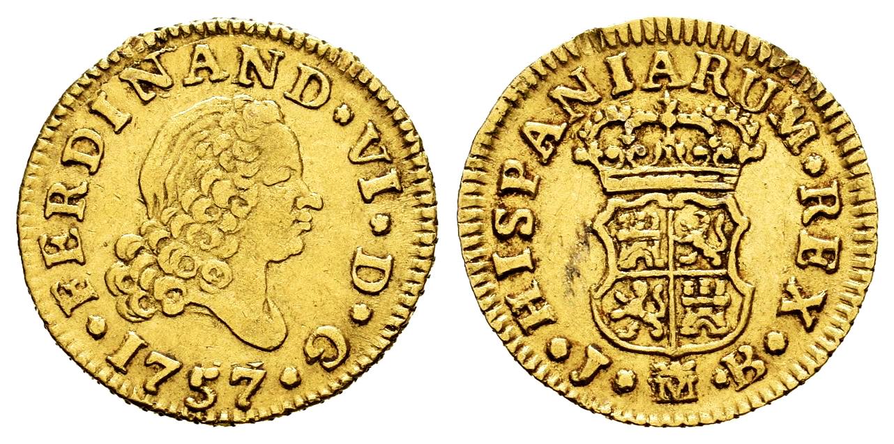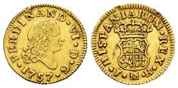 Ferdinand VI (1746-1759). 1/2 escudo. 1757. Madrid. JB. (Cal-561). Au. 1,77 g. Fourth bust. Nicks on edge. Choice VF. Est...200,00.