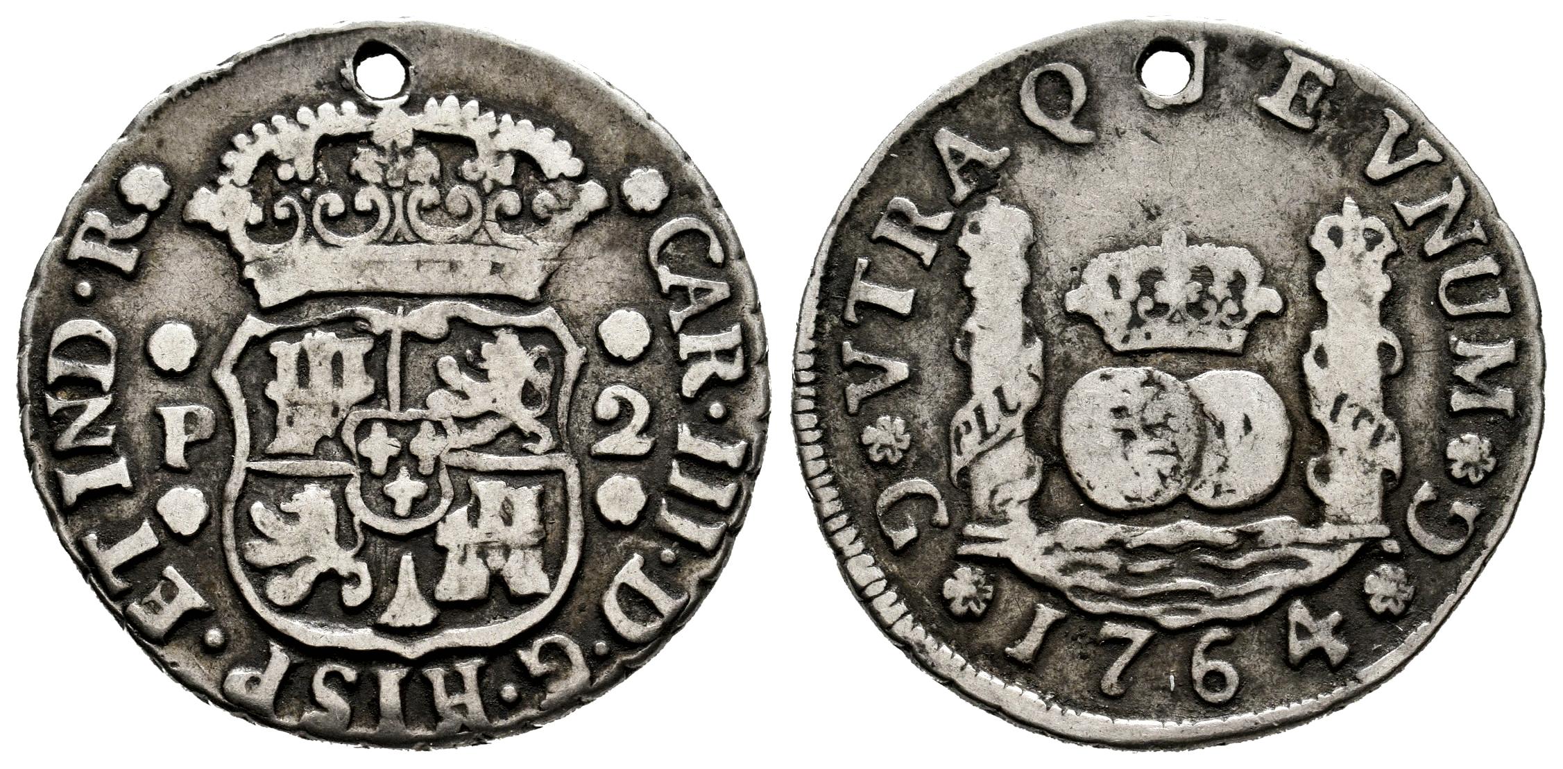 Charles III (1759-1788). 2 reales. 1764. Guatemala. P. (Cal-549). Ag. 6,54 g. Holed. Rare. VF. Est...200,00.