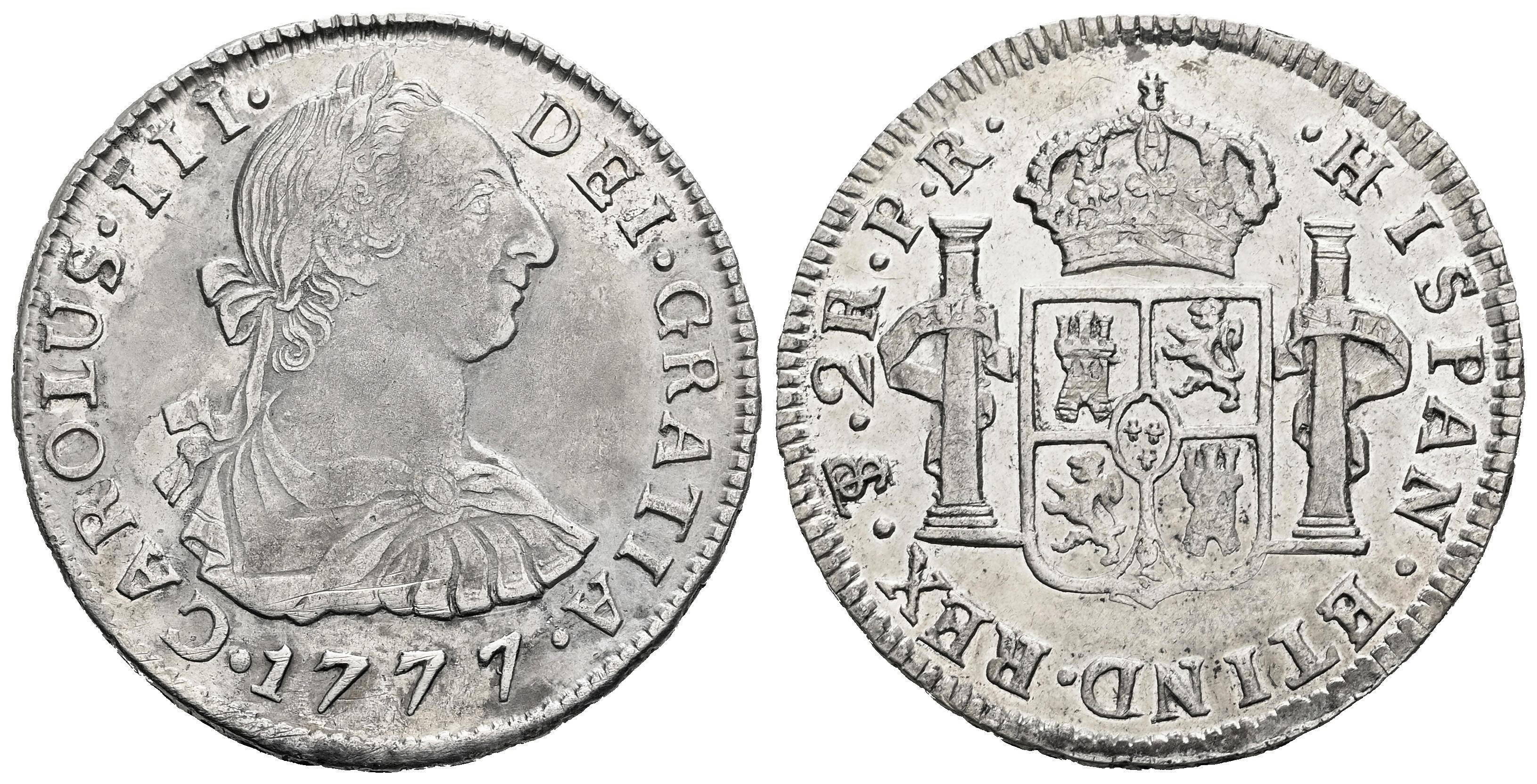 Charles III (1759-1788). 2 reales. 1777. Potosi. PR. (Cal-719). Ag. 6,64 g. Hairlines on obverse. Traces of luster. Attractive. Choice VF. Est...120,00.