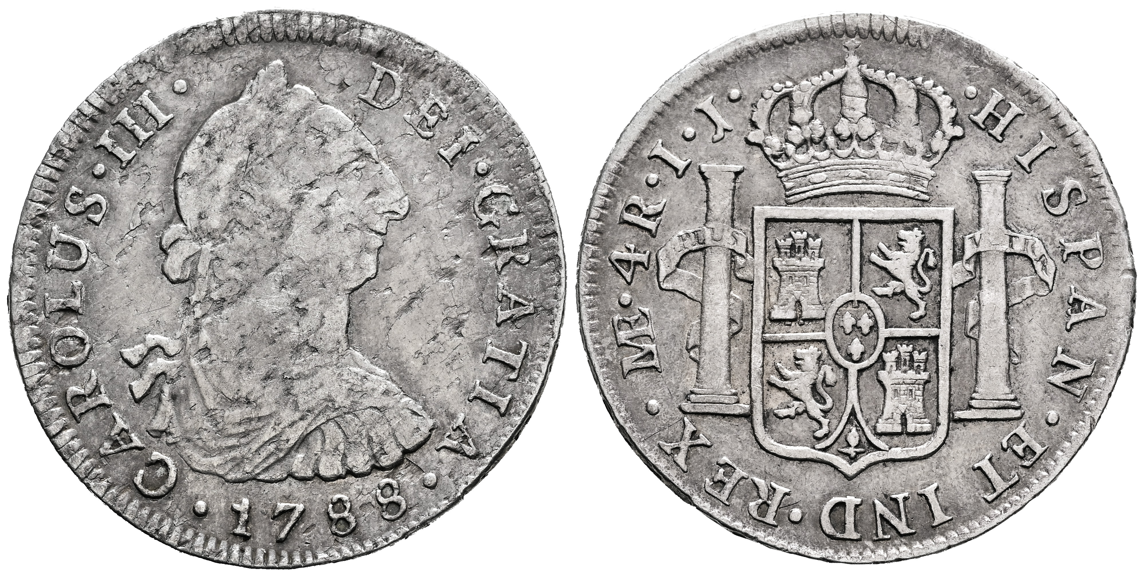 Charles III (1759-1788). 4 reales. 1788. Lima. IJ. (Cal-851). Ag. 13,24 g. Planchet flaws on obverse. Almost VF/VF. Est...100,00.