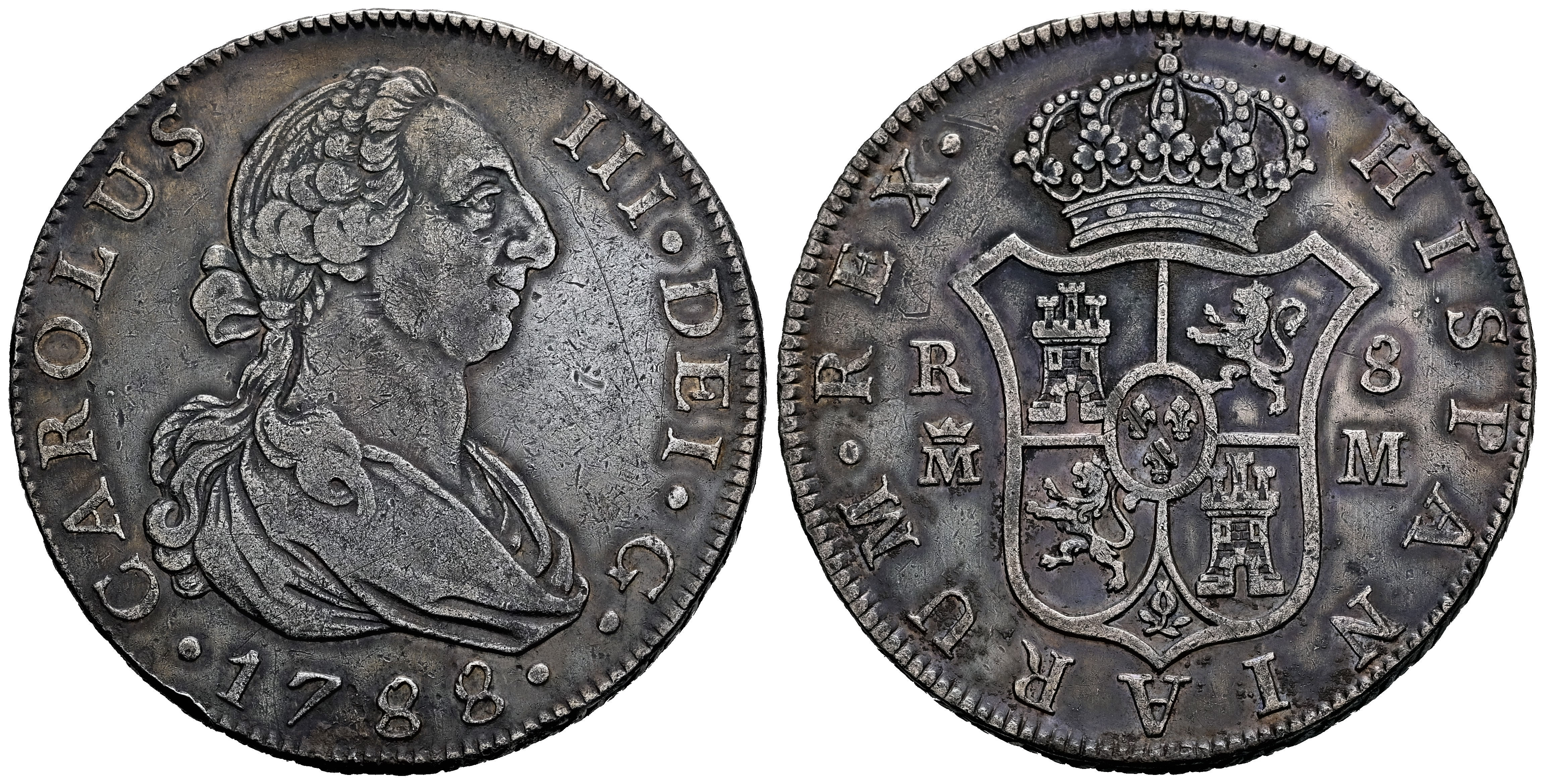 Charles III (1759-1788). 8 reales. 1788. Madrid. M. (Cal-1070). Ag. 26,98 g. Minimal hairlines. Slight patina. Very scarce. VF. Est...450,00.