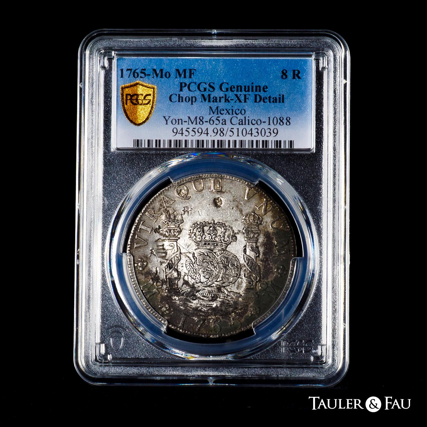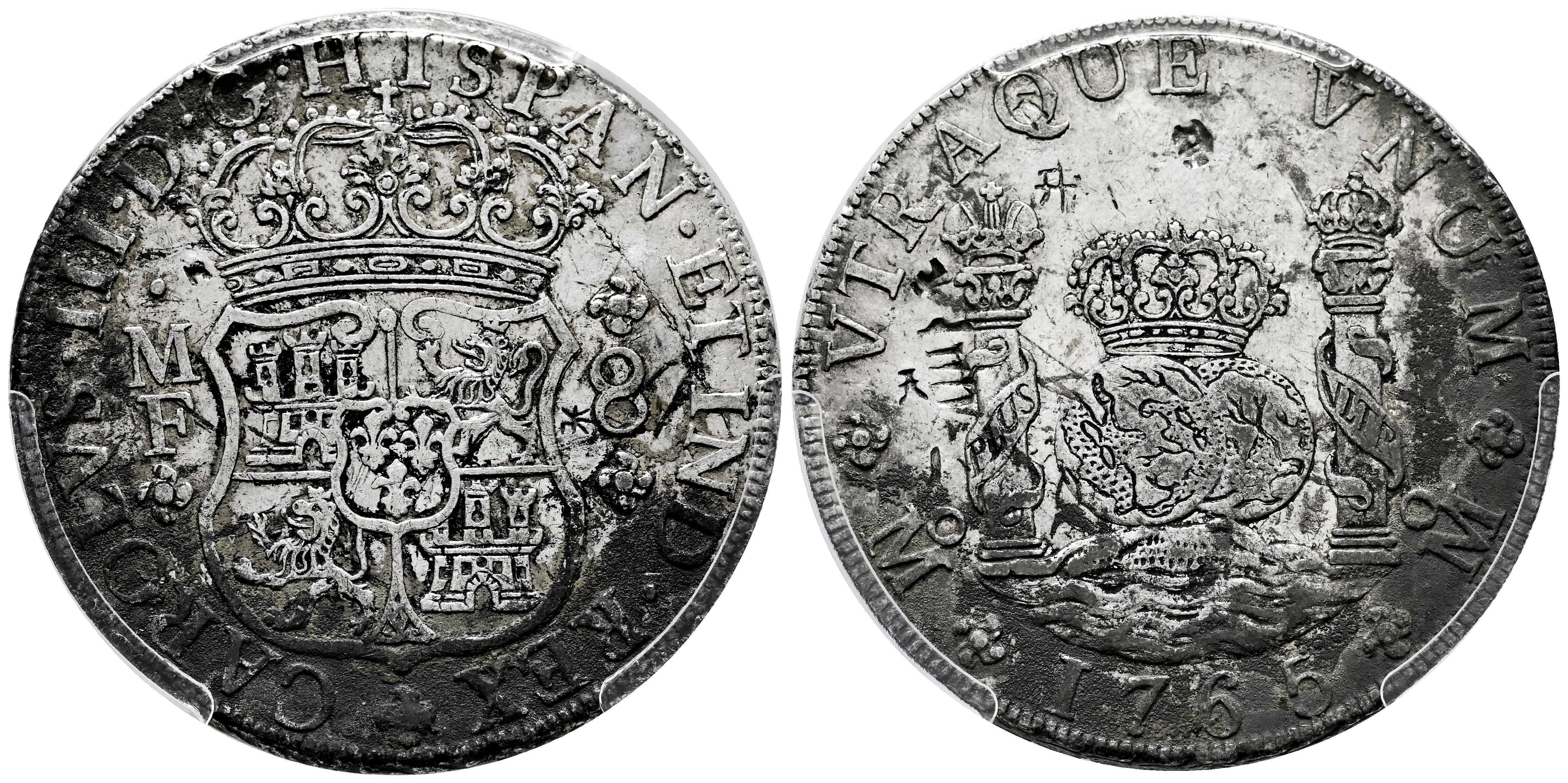 Charles III (1759-1788). 8 reales. 1765. Mexico. MF. (Cal-1088). Ag. Some oxidations. Slabbed by PCGS as Geuine, Chopmark-XF Detaill. Est...400,00.
