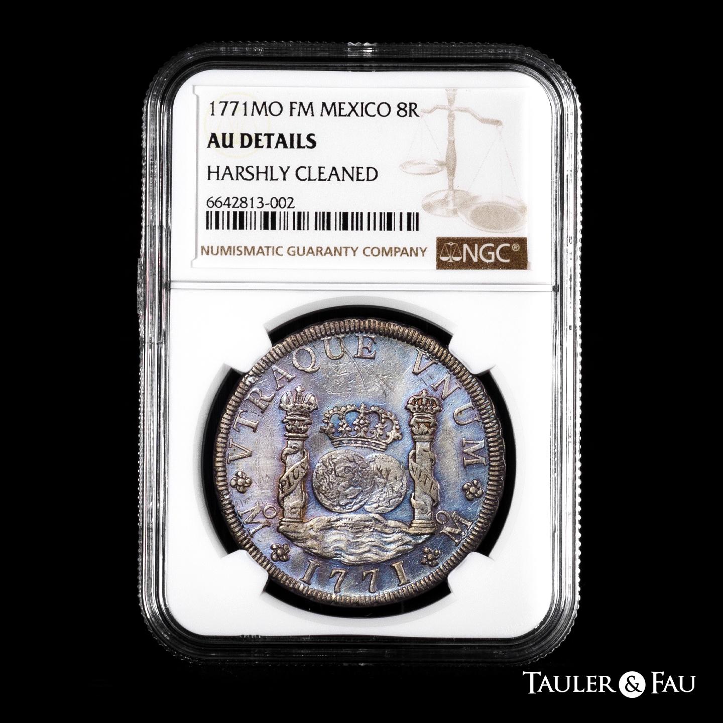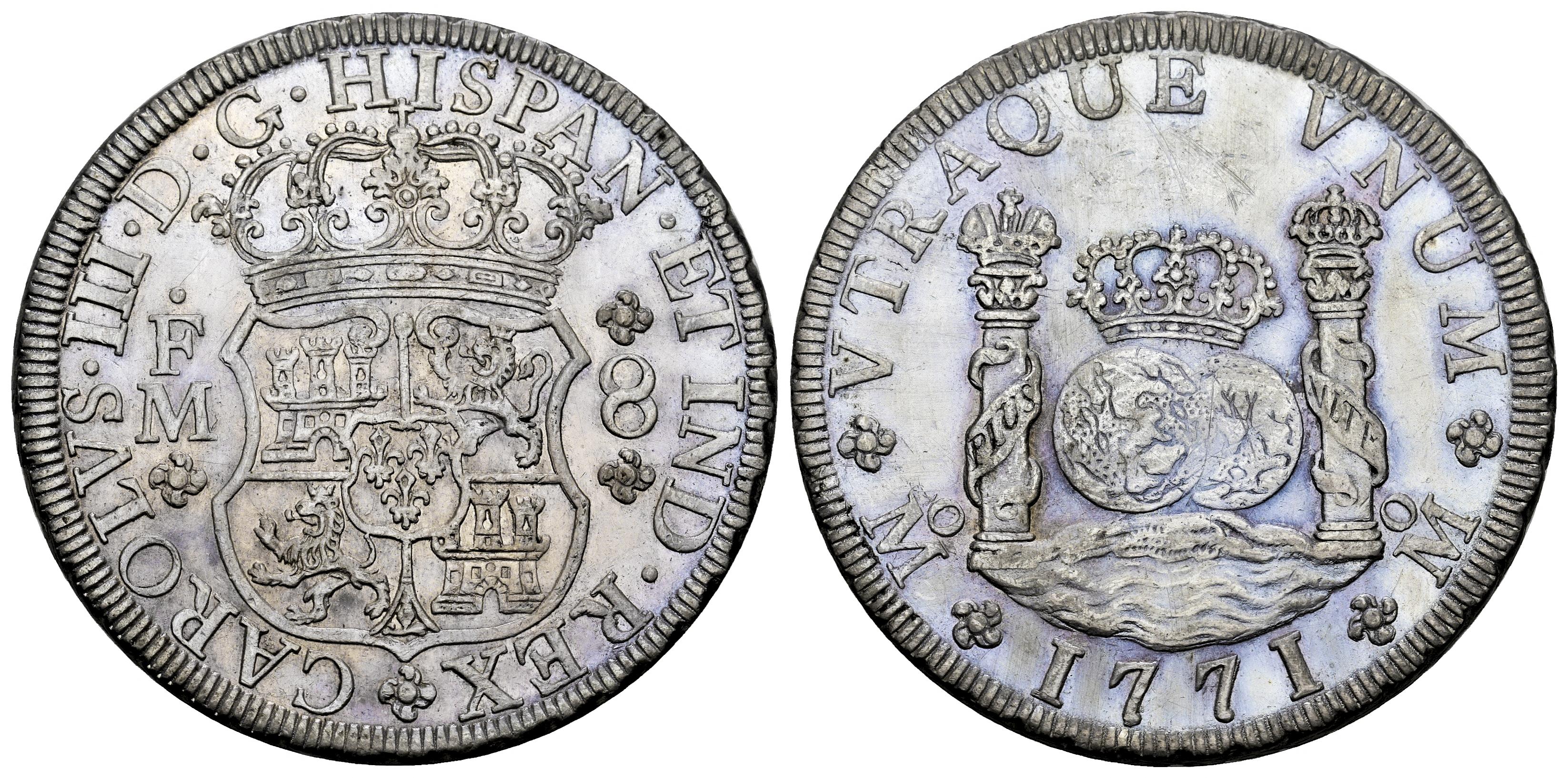 Charles III (1759-1788). 8 reales. 1771. Mexico. FM. (Cal-1103). Ag. Light bluish tone. Slabbed by NGC as AU Details, Harshly cleaned. Est...650,00.
