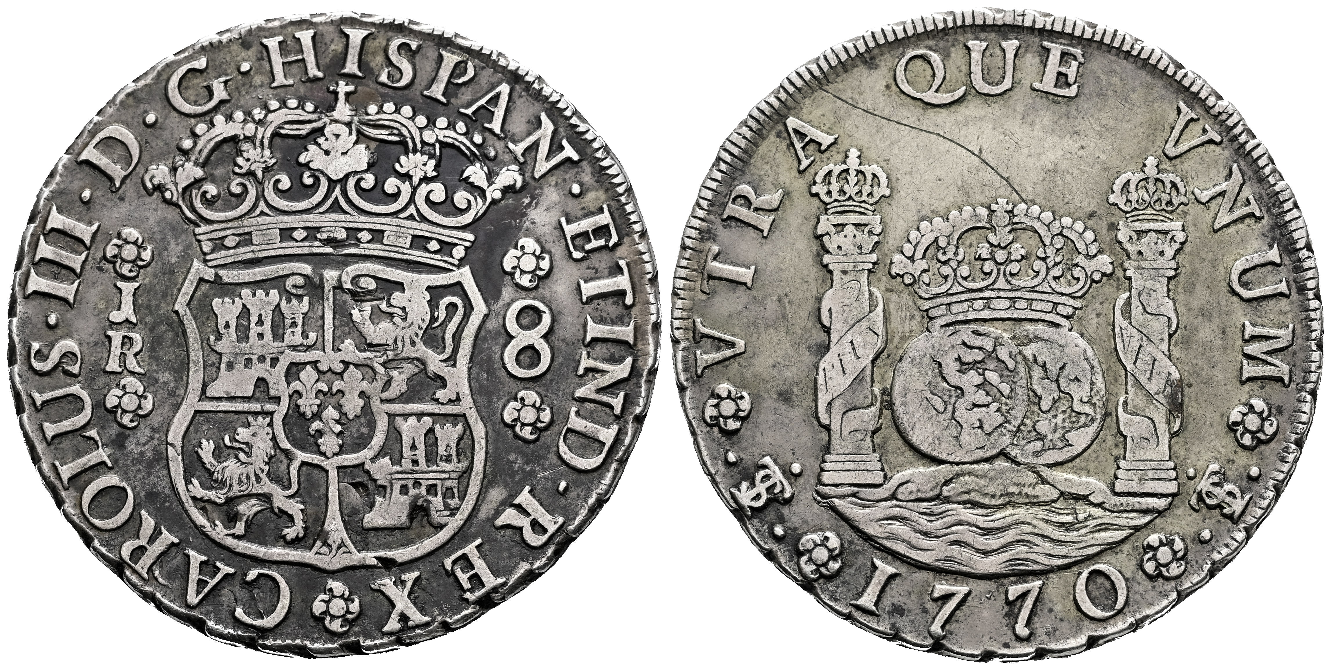 Charles III (1759-1788). 8 reales. 1770. Potosi. JR. (Cal-1168). Ag. 27,18 g. Scratch on reverse. Slight patina. Scarce. VF. Est...500,00.