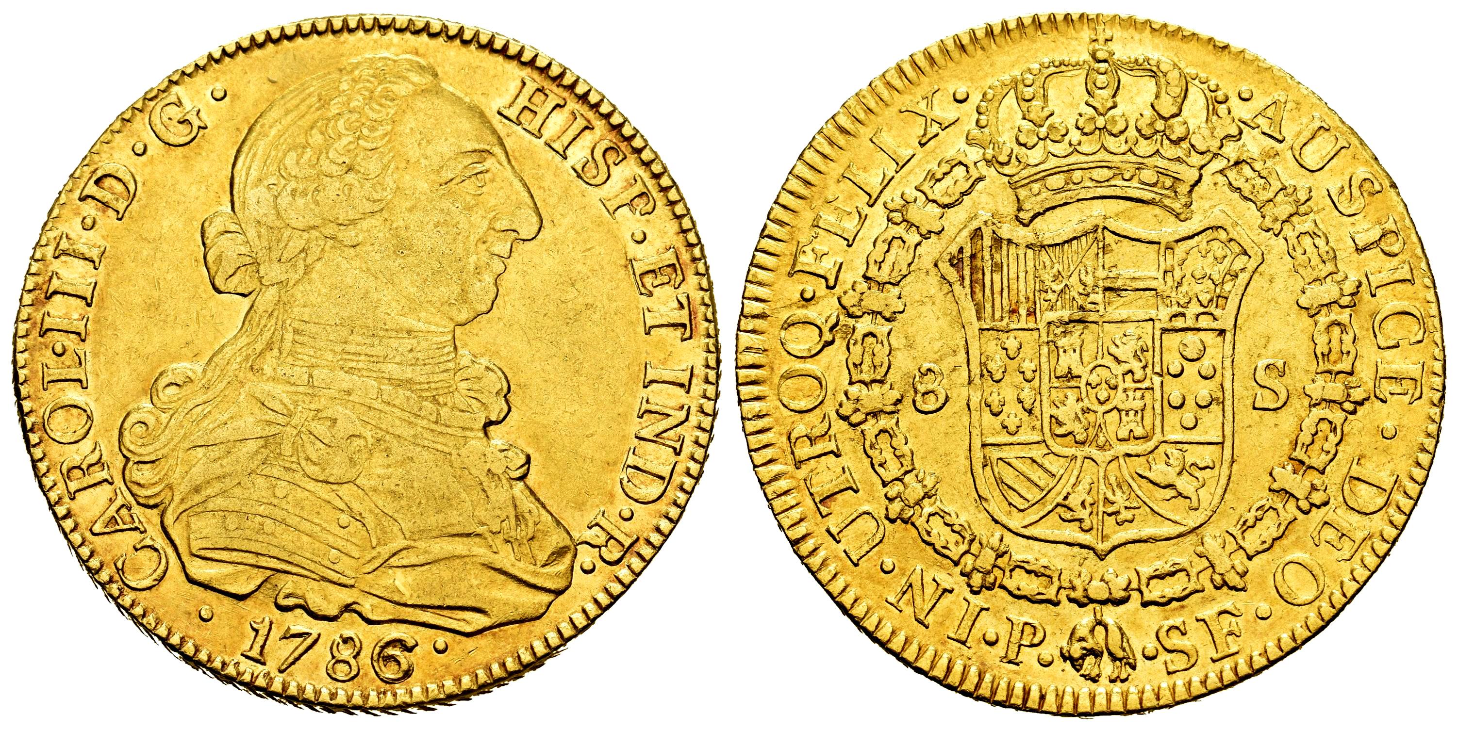 Charles III (1759-1788). 8 escudos. 1786. Popayan. SF. (Cal-2055). (Cal onza-822). (Restrepo-73-88). Au. 26,93 g. Traces of luster. Almost XF. Est...3500,00.