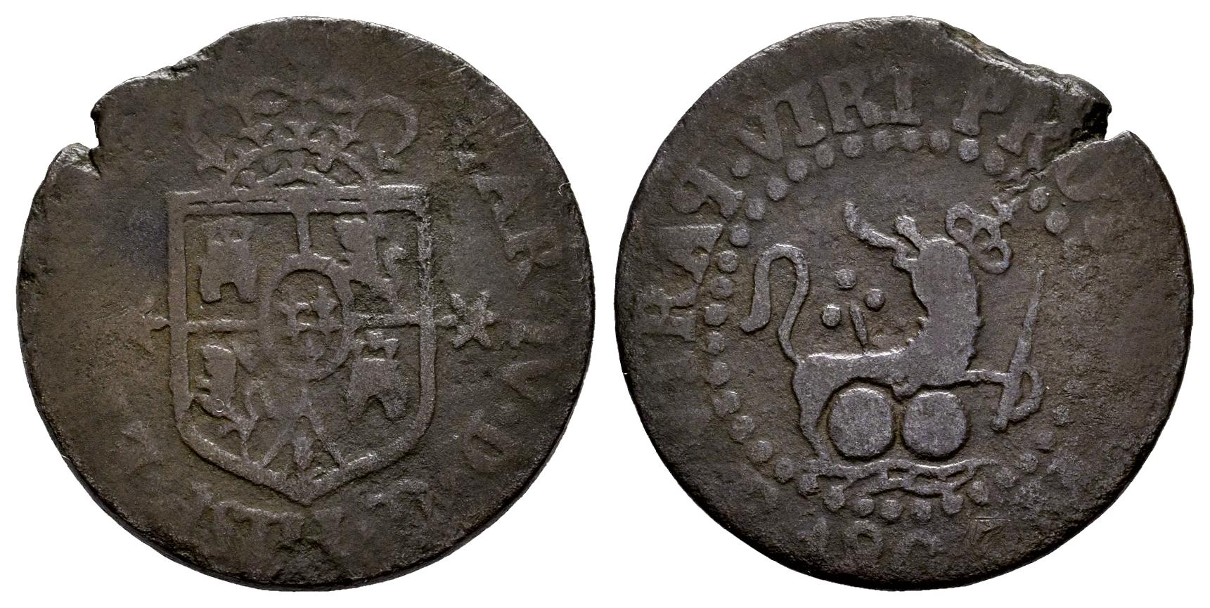 Charles IV (1788-1808). 1 quarto. 1805. Manila. (Cal-12). Ae. 3,19 g. Usual weak strike of this mint. Scarce. Choice F. Est...200,00.