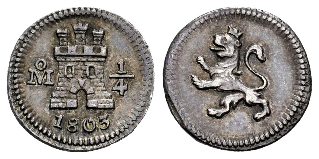 Charles IV (1788-1808). 1/4 real. 1803. Mexico. (Cal-133). Ag. 0,85 g. Wonderful toned. AU/XF. Est...200,00.