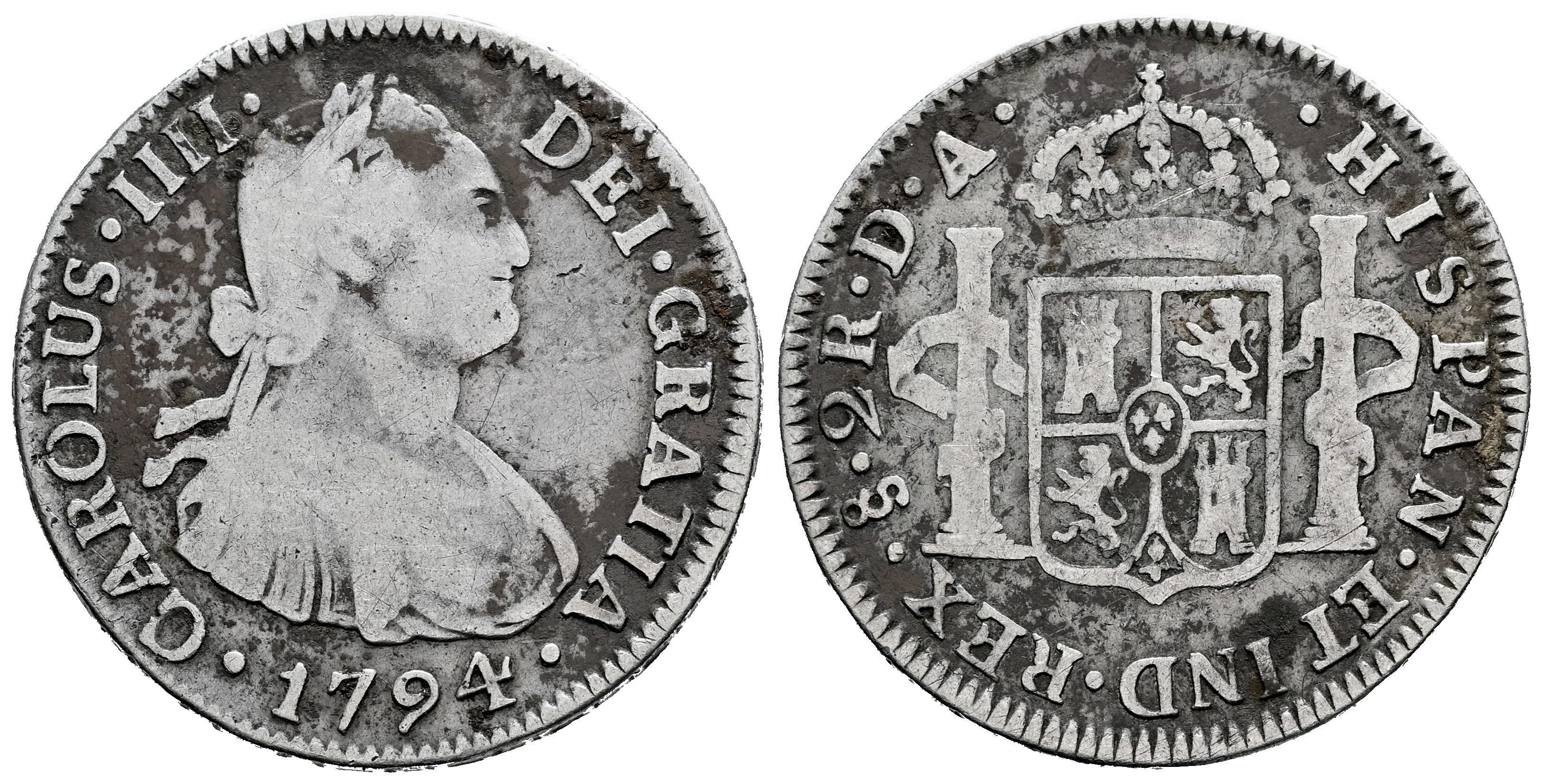 Charles IV (1788-1808). 2 reales. 1794. Santiago. DA. (Cal-691). Ag. 6,47 g. Irregular patina. Scarce. F/Choice F. Est...60,00.