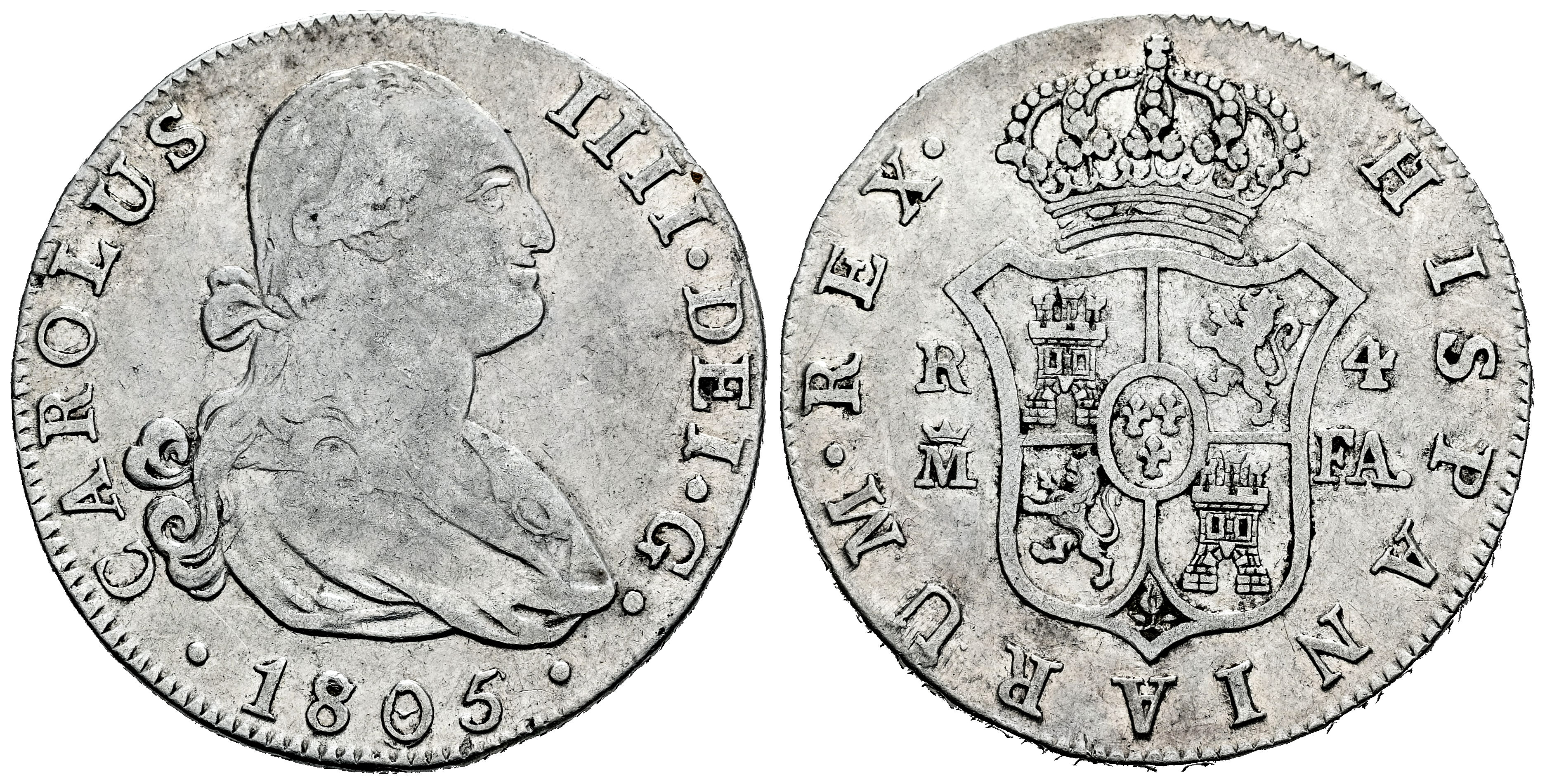 Charles IV (1788-1808). 4 reales. 1805/795. Madrid. FA. (Cal-786). Ag. 13,34 g. Overdate. Scarce. Choice F. Est...75,00.
