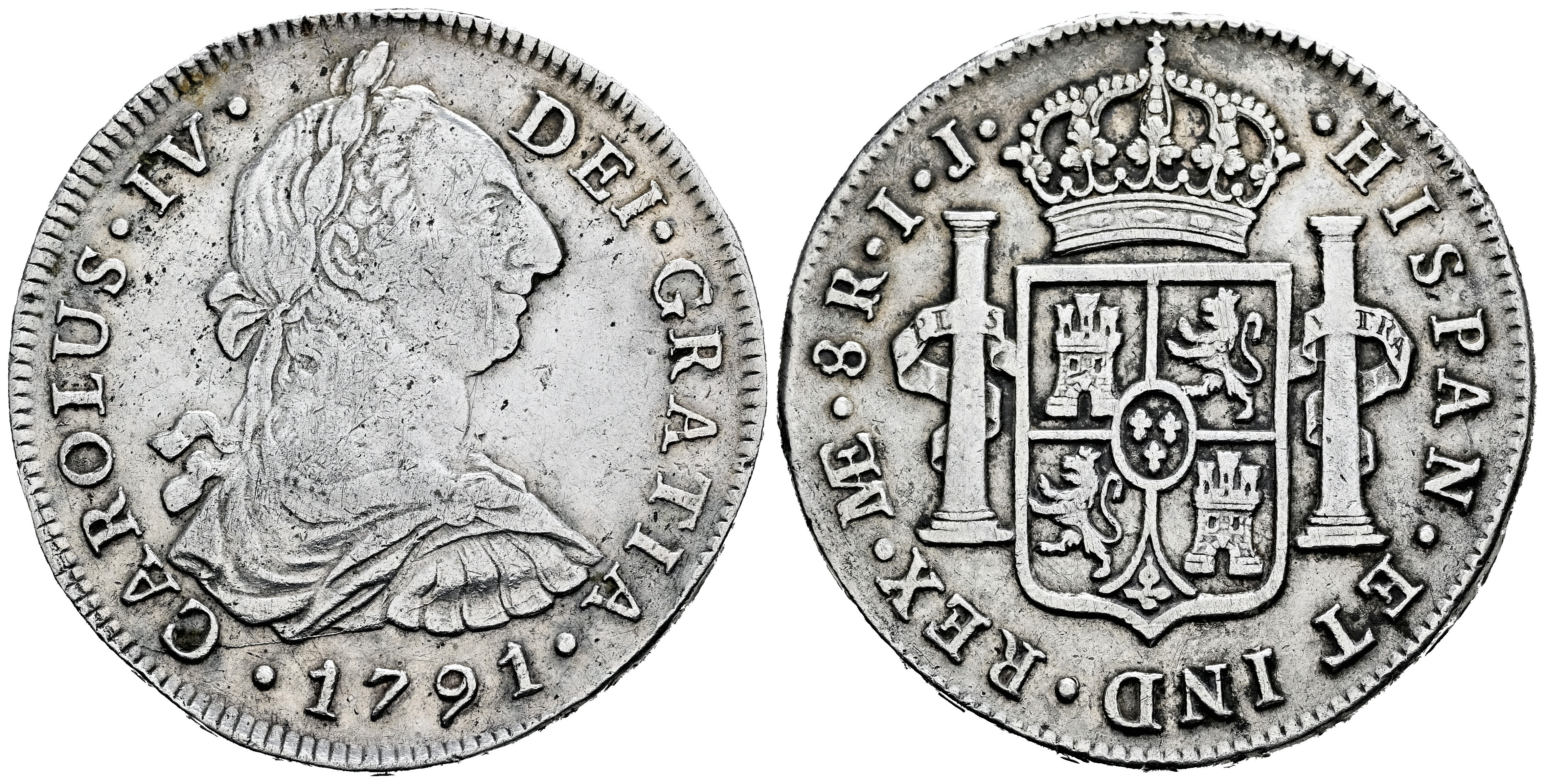 Charles IV (1788-1808). 8 reales. 1791. Lima. IJ. (Cal-905). Ag. 26,19 g. Bust of Charles III and Ordinal IV. Cleaned. Scarce. VF/Almost VF. Est...120,00.