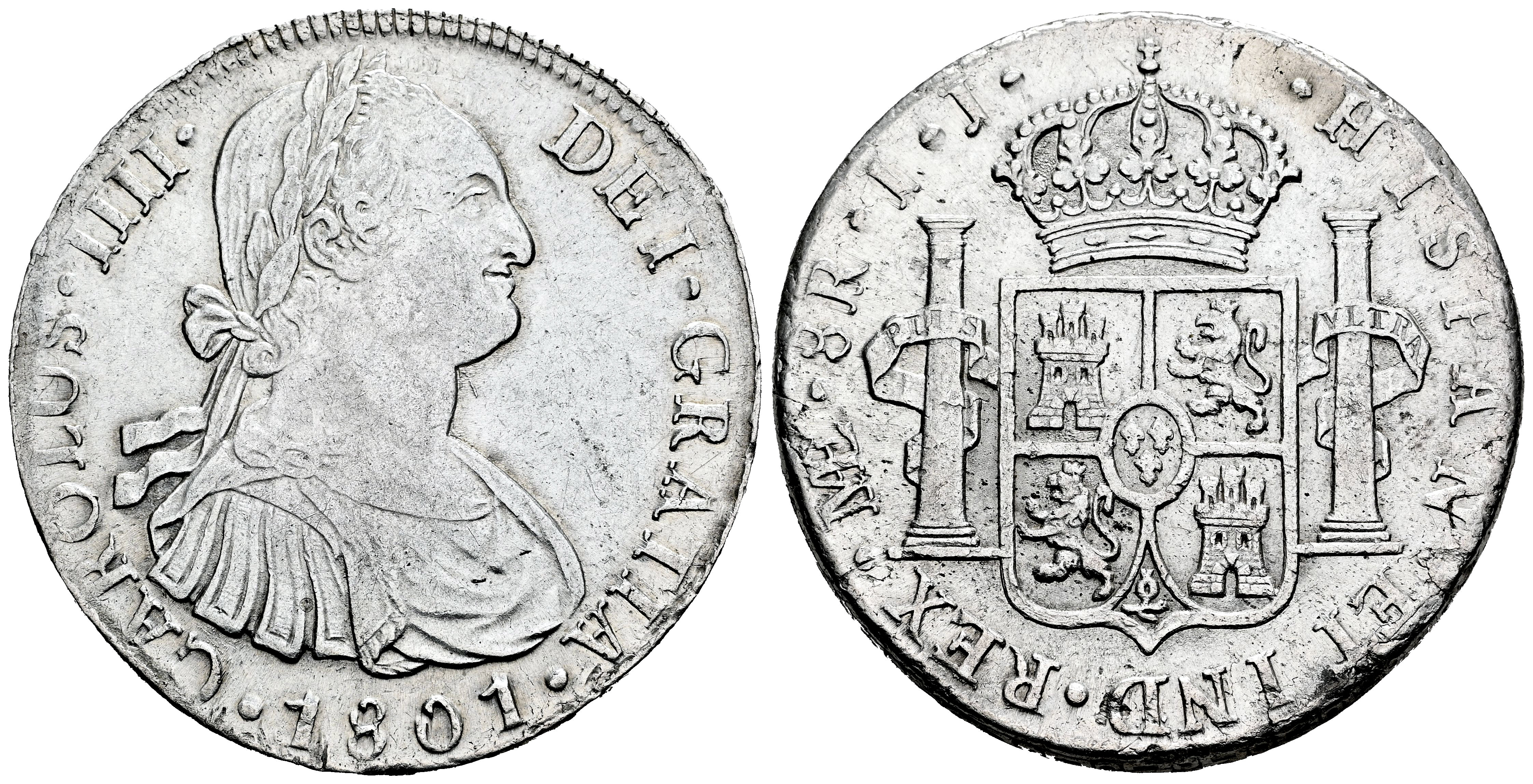 Charles IV (1788-1808). 8 reales. 1801. Lima. IJ. (Cal-970). Ag. 25,75 g. Traces of luster. Almost XF/Choice VF. Est...200,00.