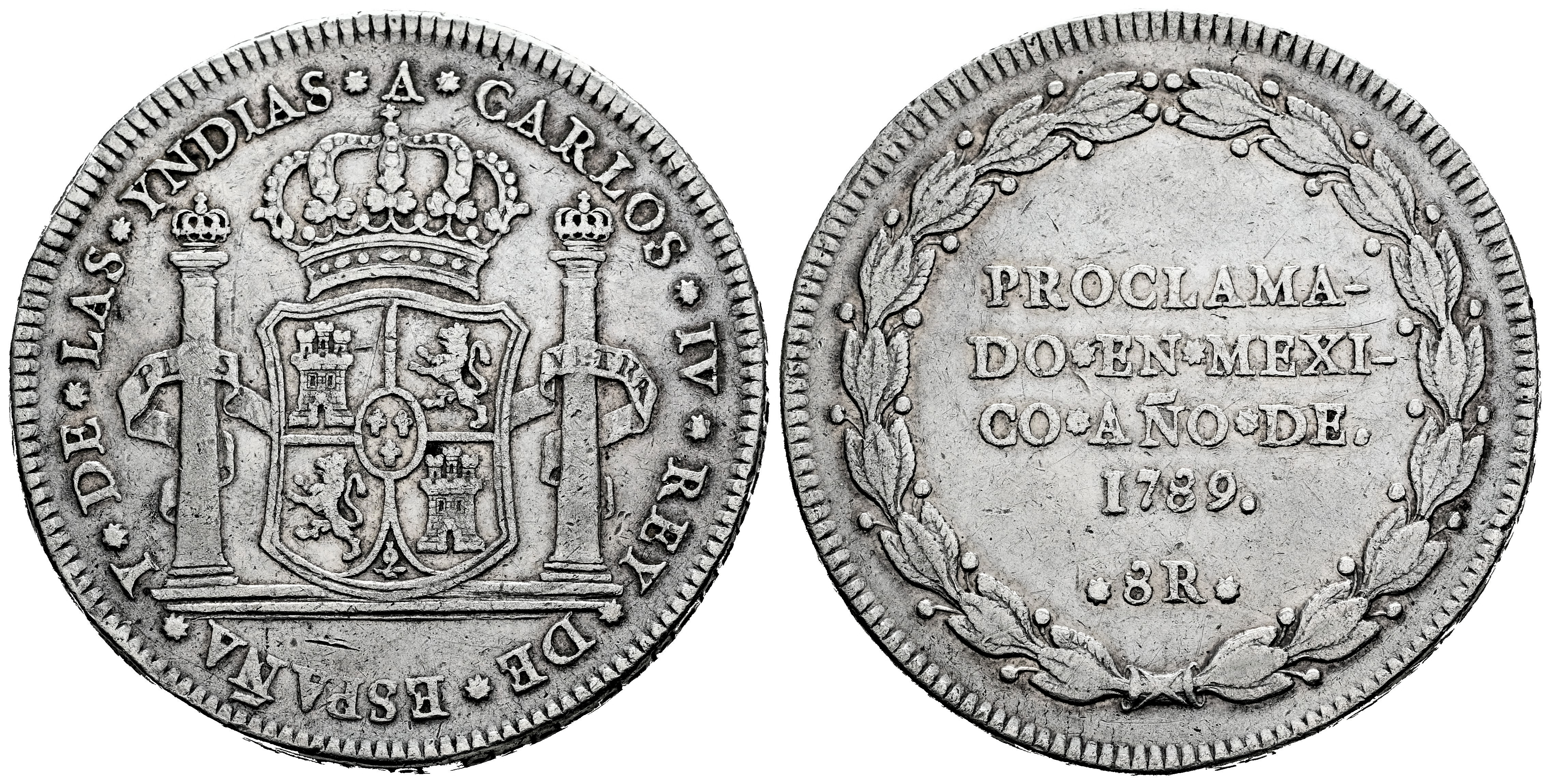 Charles IV (1788-1808). "Proclamation" medal. 1789. Mexico. (Cal-947). (Herrera-161). (Vives-135 var.). Ag. 26,76 g. 8 Reales module. Nicks on edge. Cleaned. Scarce. VF. Est...300,00.