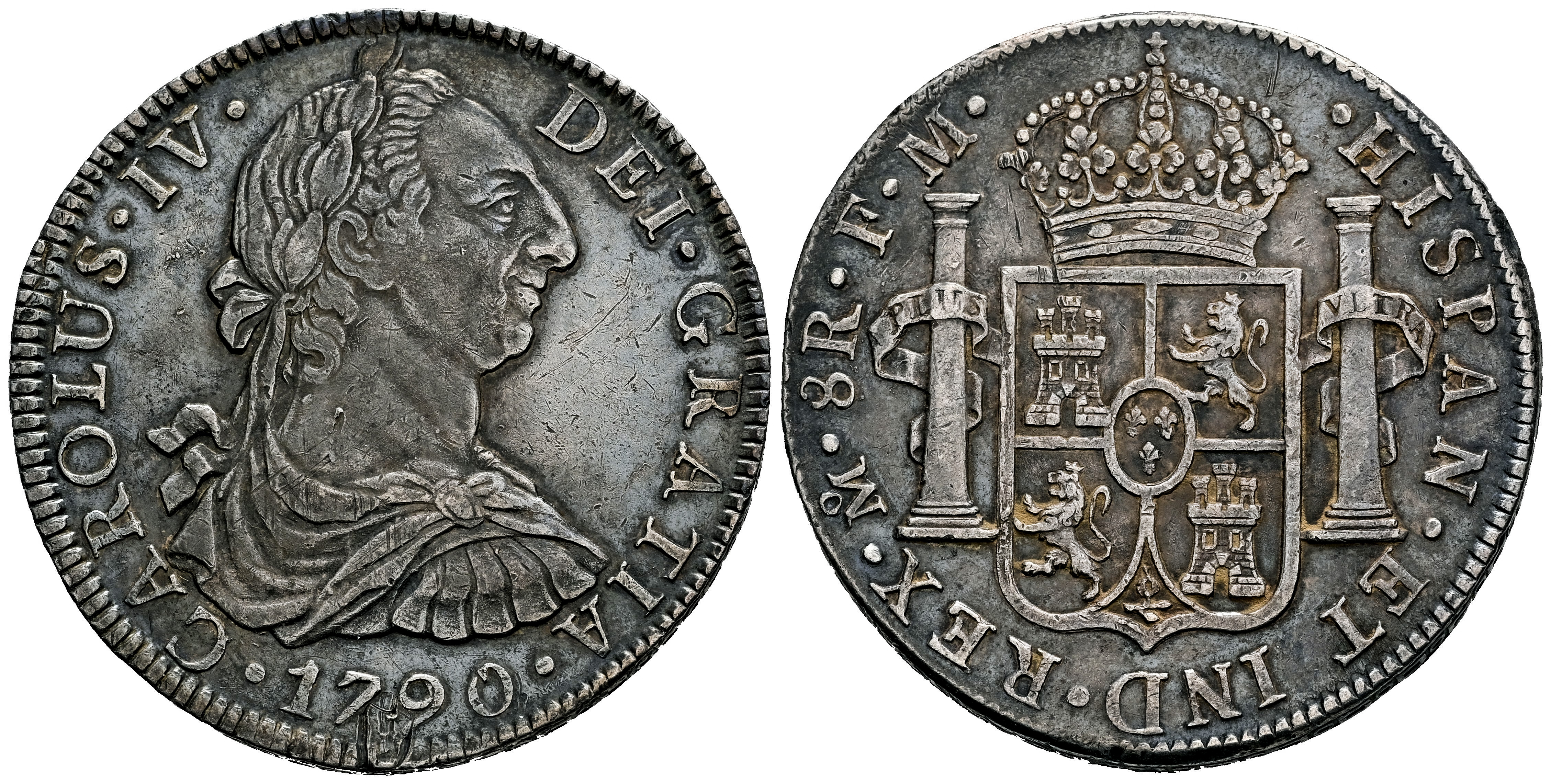 Charles IV (1788-1808). 8 reales. 1790. Mexico. FM. (Cal-951). Ag. 27,04 g. Bust of Charles III and Ordinal IV. Scratches on obverse. Patina. Scarce. Choice VF. Est...200,00.