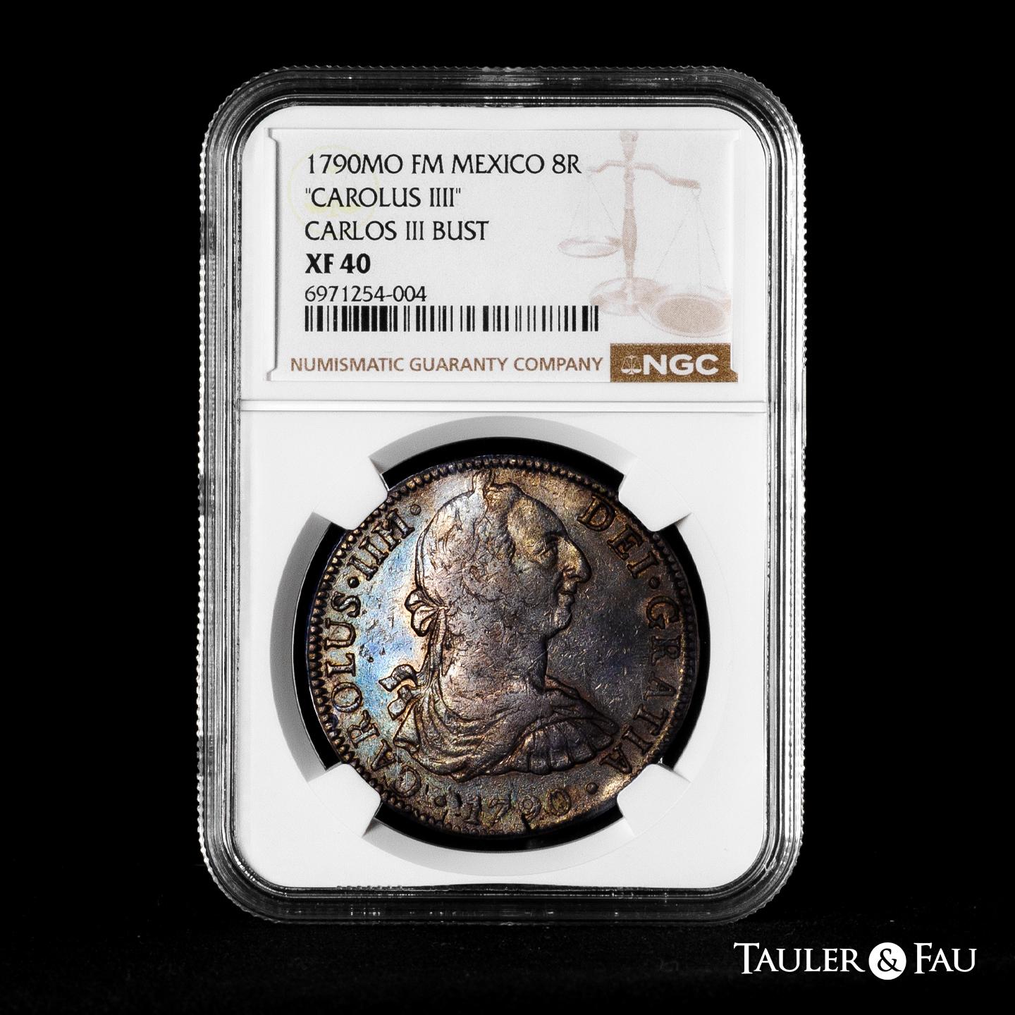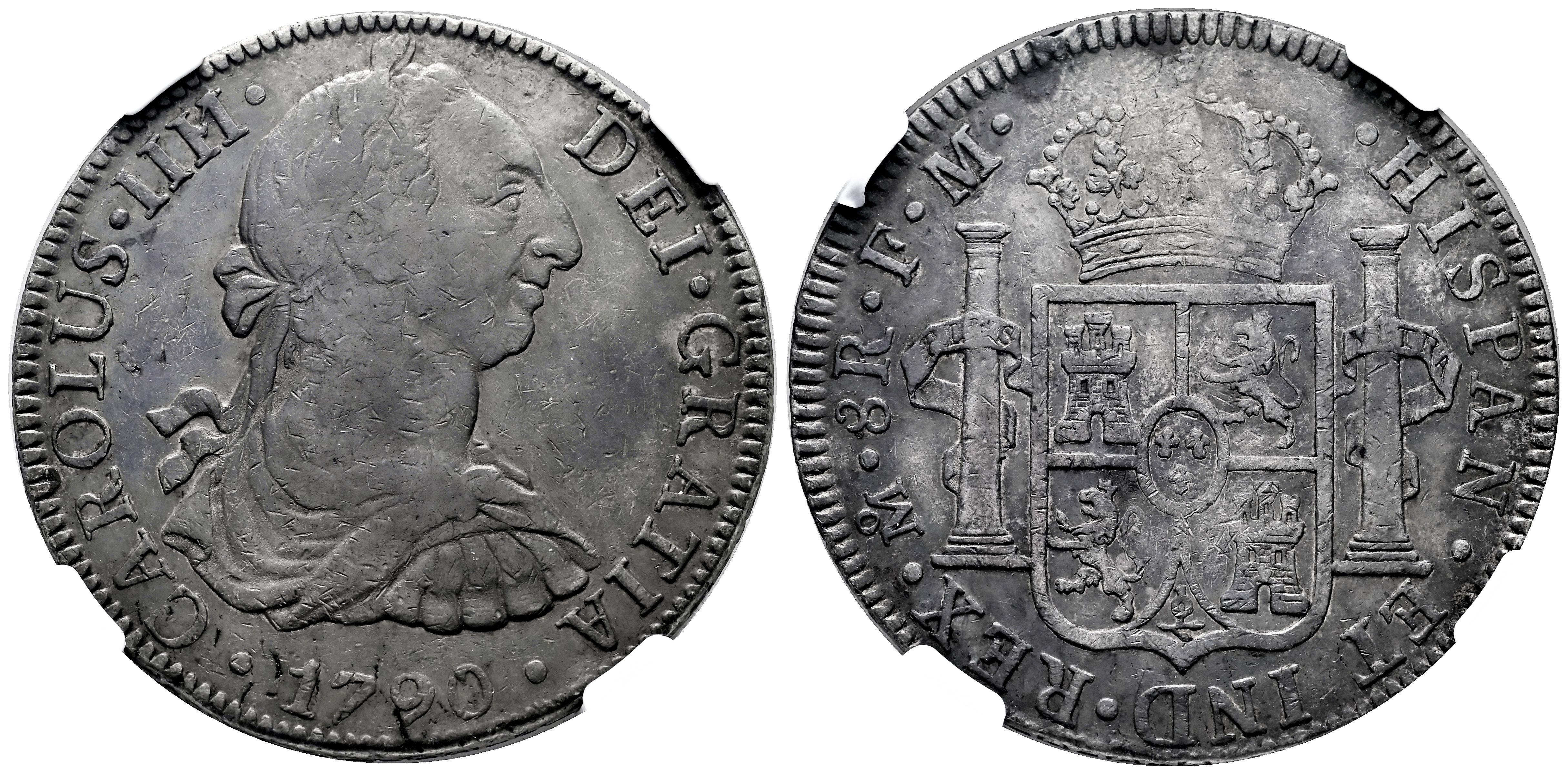 Charles IV (1788-1808). 8 reales. 1790. Mexico. FM. (Cal-952). Ag. Bust of Charles III and ordinal of king IIII. Patina. Slabbed by NGC as XF 40. Est...200,00.