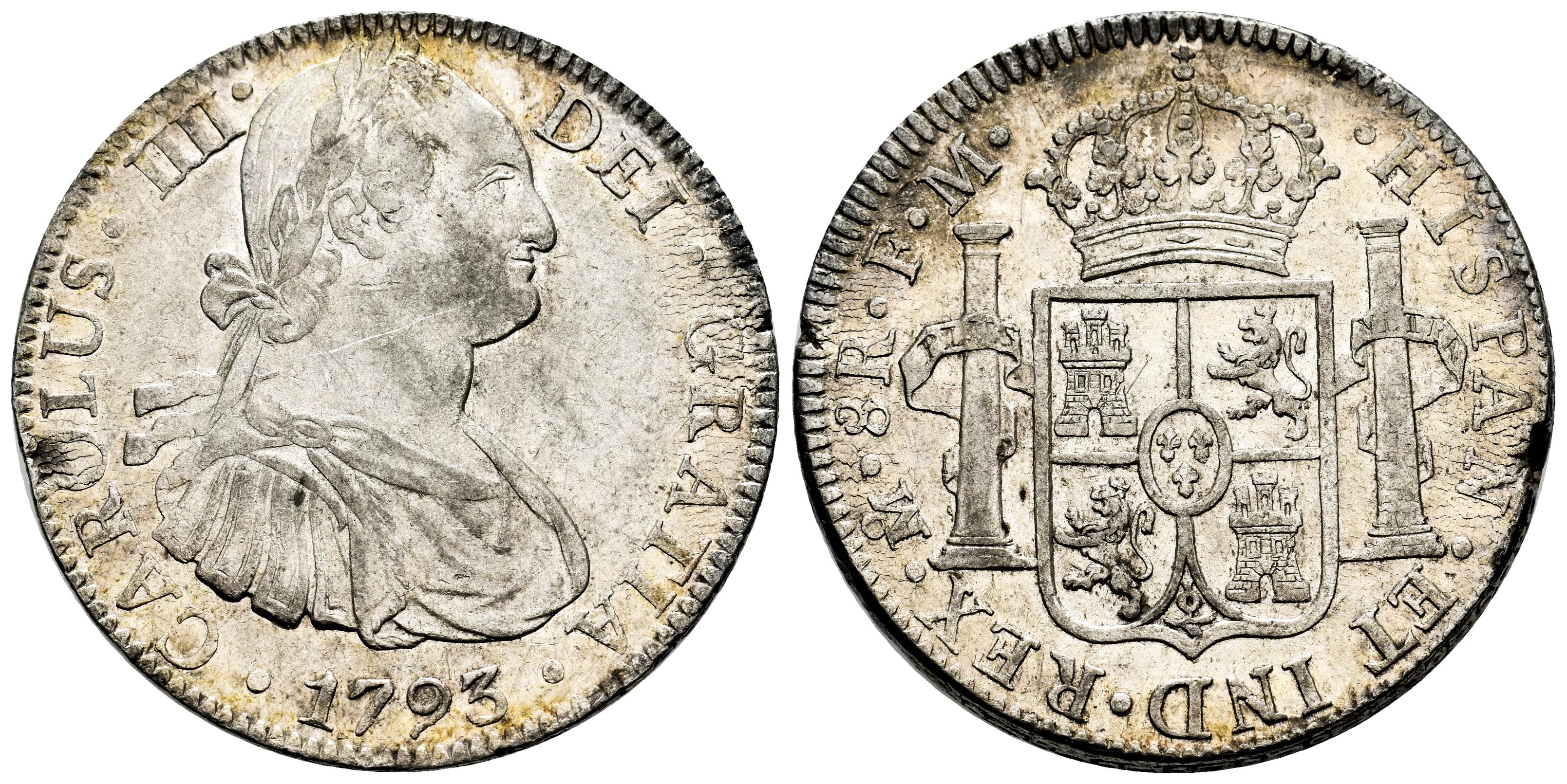 Charles IV (1788-1808). 8 reales. 1793. Mexico. FM. (Cal-955). Ag. 26,88 g. Minor scratches. Planchet defect on edge. Traces of luster. Choice VF. Est...200,00.