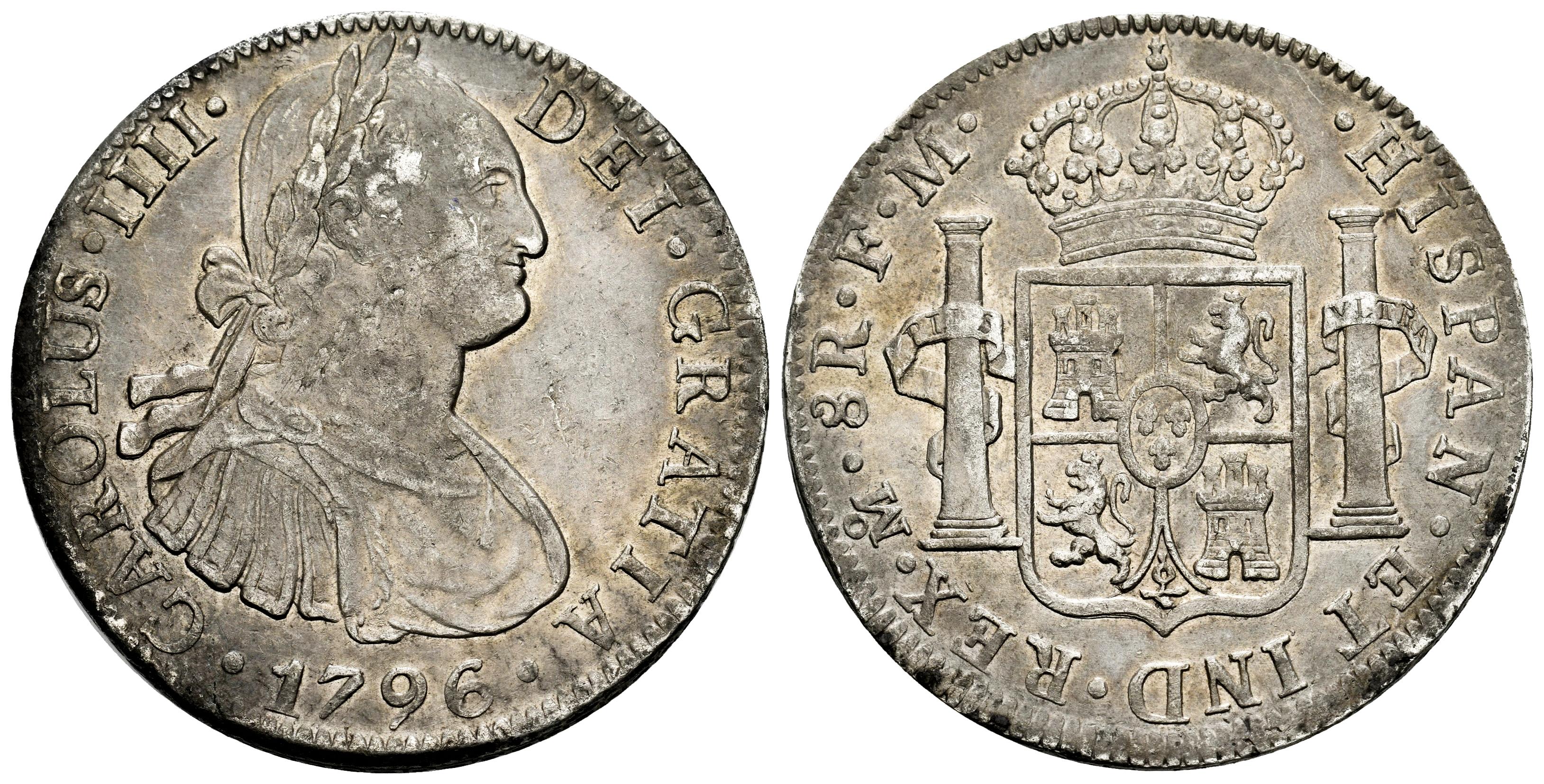 Charles IV (1788-1808). 8 reales. 1796. Mexico. FM. (Cal-959). Ag. 26,78 g. Beautiful patina with some original luster remaining. Choice VF. Est...150,00.