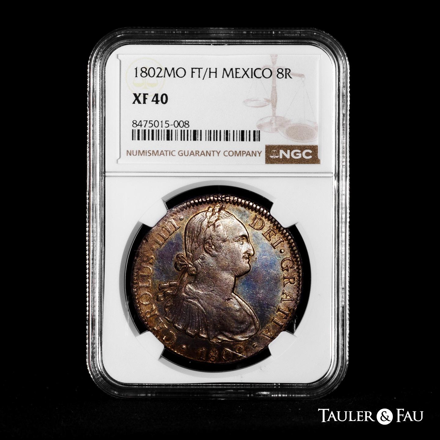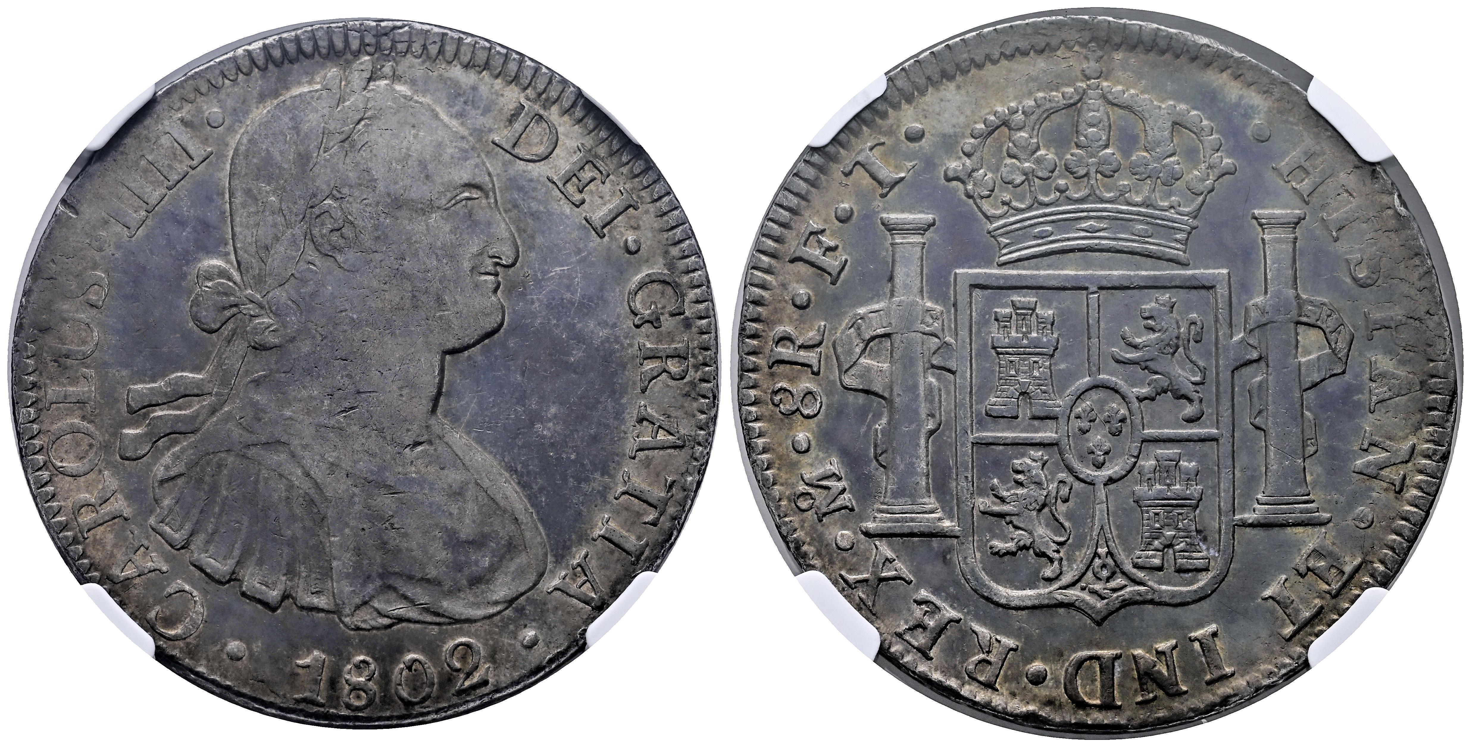 Charles IV (1788-1808). 8 reales. 1802. Mexico. FT/H. (Cal-975). Ag. Assayer T over H. Patina. Rare. Slabbed by NGC as XF 40. Est...200,00.