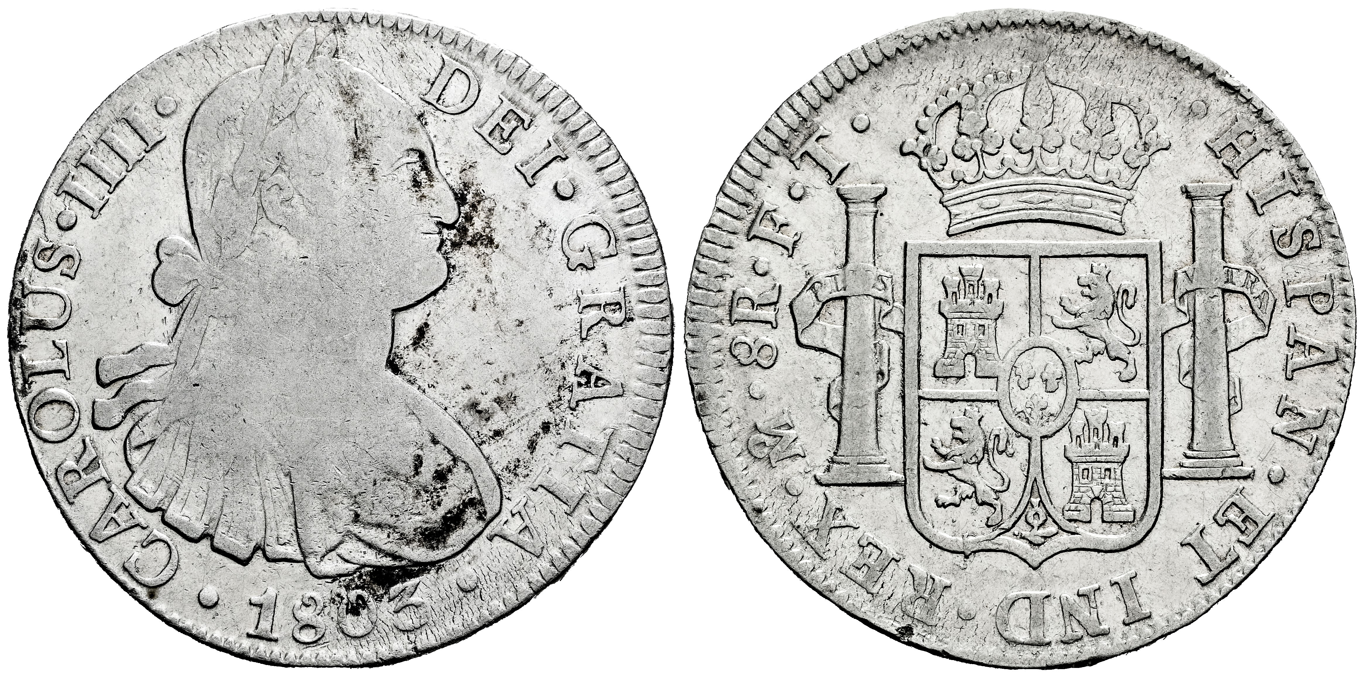 Charles IV (1788-1808). 8 reales. 1803. Mexico. FT. (Cal-977). Ag. 26,82 g. Hairlines. Cleaned. Choice F/Almost VF. Est...90,00.