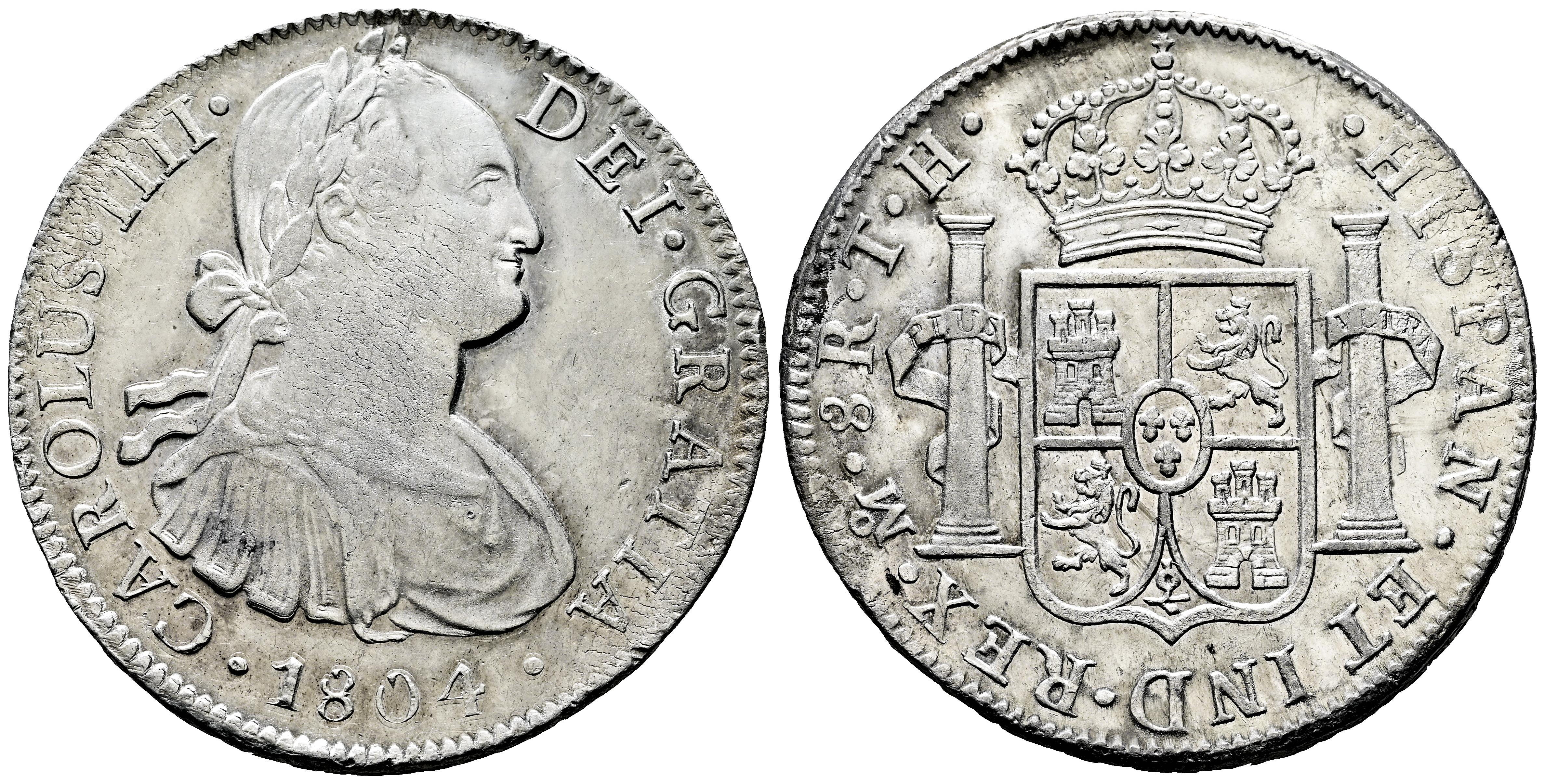 Charles IV (1788-1808). 8 reales. 1804. Mexico. TH. (Cal-980). Ag. 27,01 g. Traces of luster. Choice VF/XF. Est...180,00.