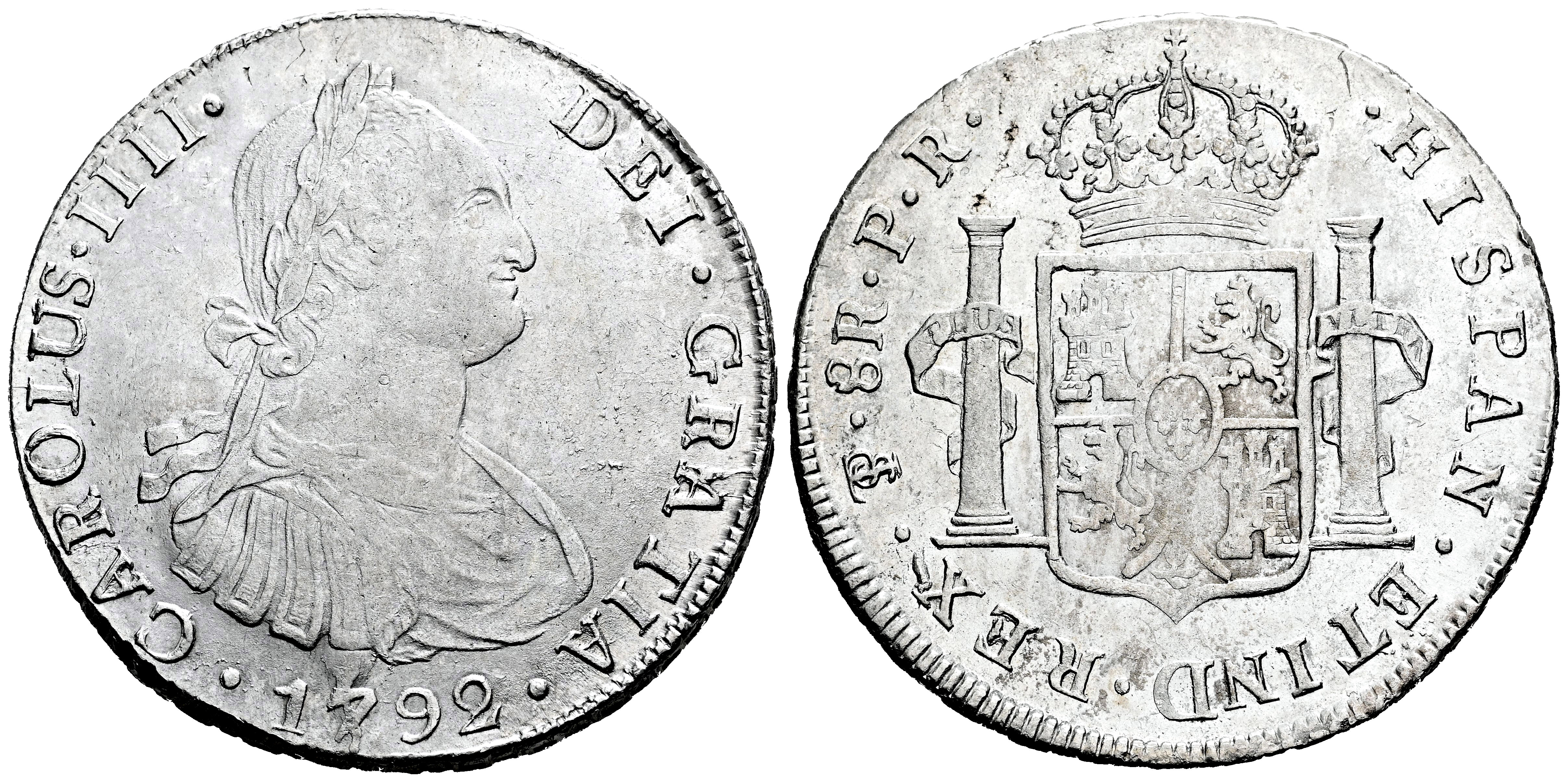Charles IV (1788-1808). 8 reales. 1792. Potosi. PR. (Cal-992). Ag. 26,81 g. Weak strike. Traces of luster. Choice VF. Est...120,00.