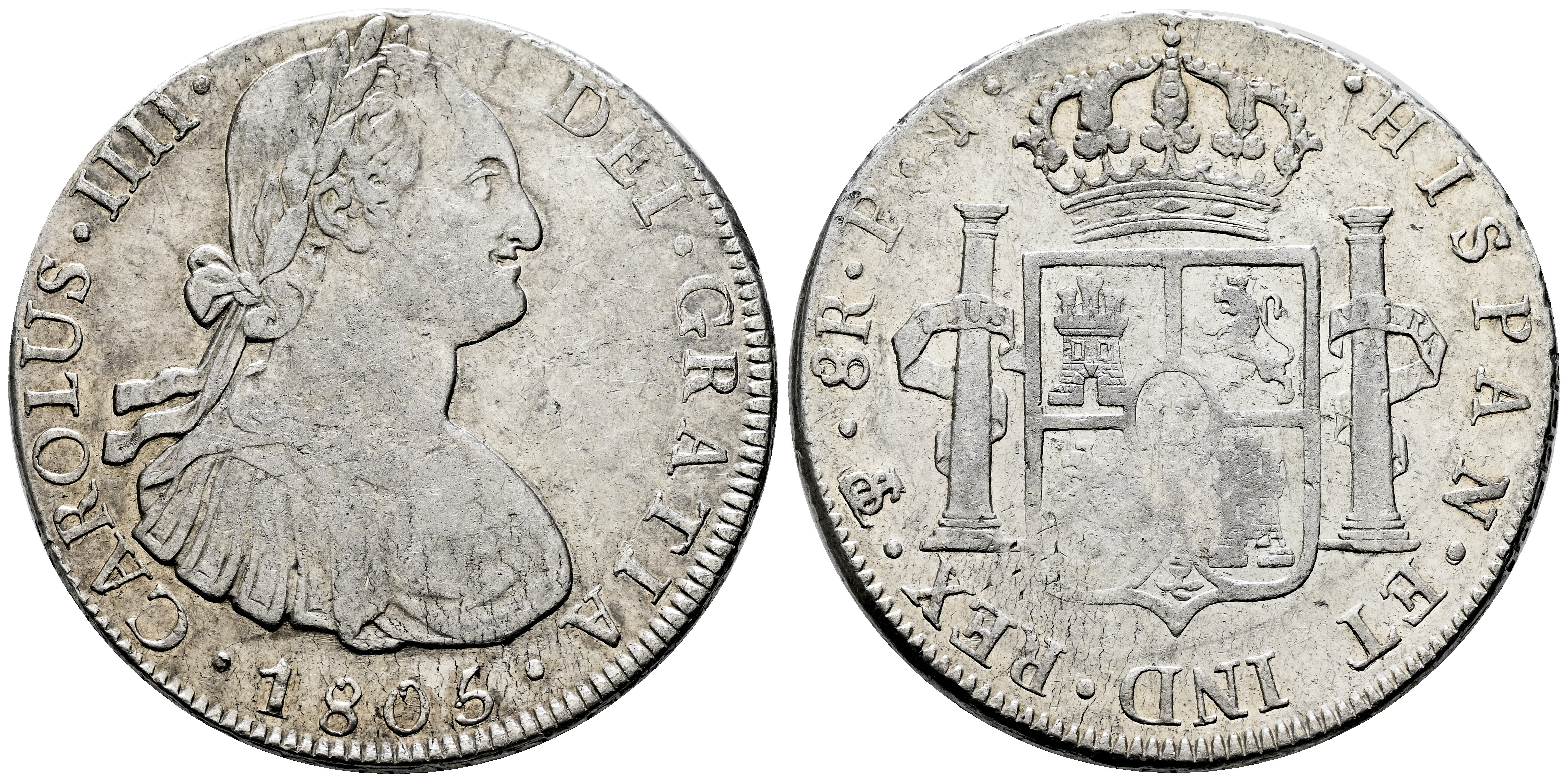Charles IV (1788-1808). 8 reales. 1805. Potosi. PJ. (Cal-1010). Ag. 26,78 g. Weak strike. Traces of luster. VF. Est...90,00.