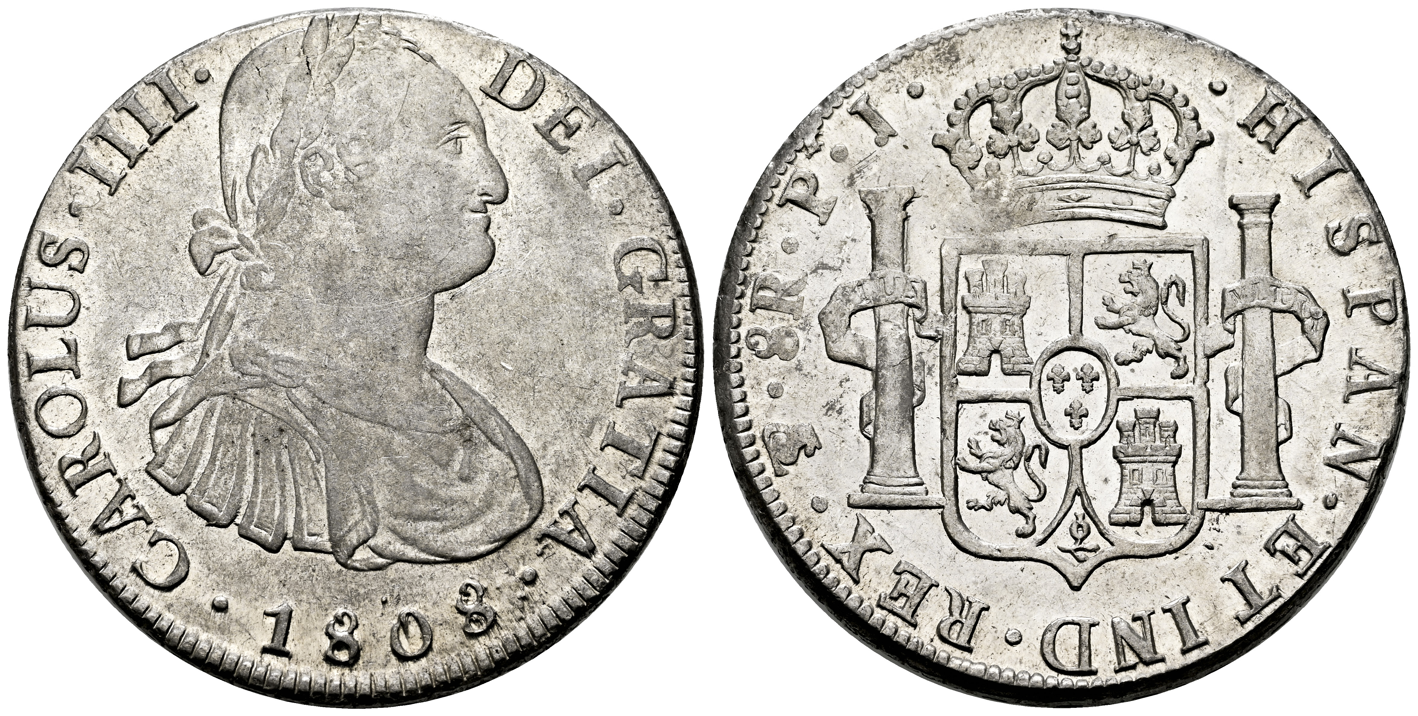 Charles IV (1788-1808). 8 reales. 1808. Potosi. PJ. (Cal-1014). Ag. 26,92 g. Weak strike. Beautiful reverse. It retains some original luster, particularly on reverse. Hairlines. Almost XF/XF. Est...180,00.