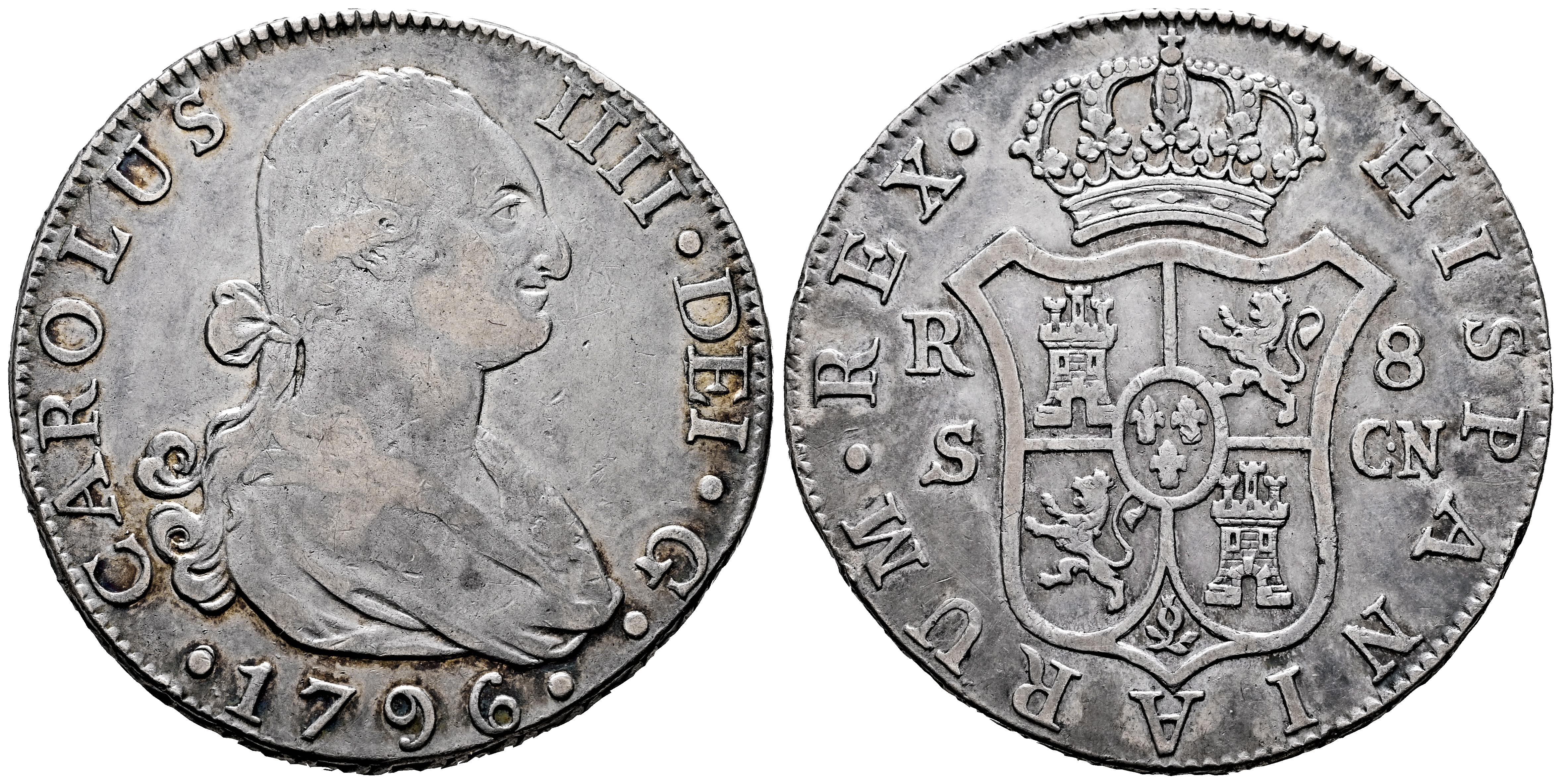 Charles IV (1788-1808). 8 reales. 1796. Sevilla. CN. (Cal-1058). Ag. 26,78 g. Light tone. Scarce. Ex Cayón (04/02/2012), lot 1087. Ex José Octavio Busto Collection. Retains the collector’s label. Almost VF. Est...200,00.