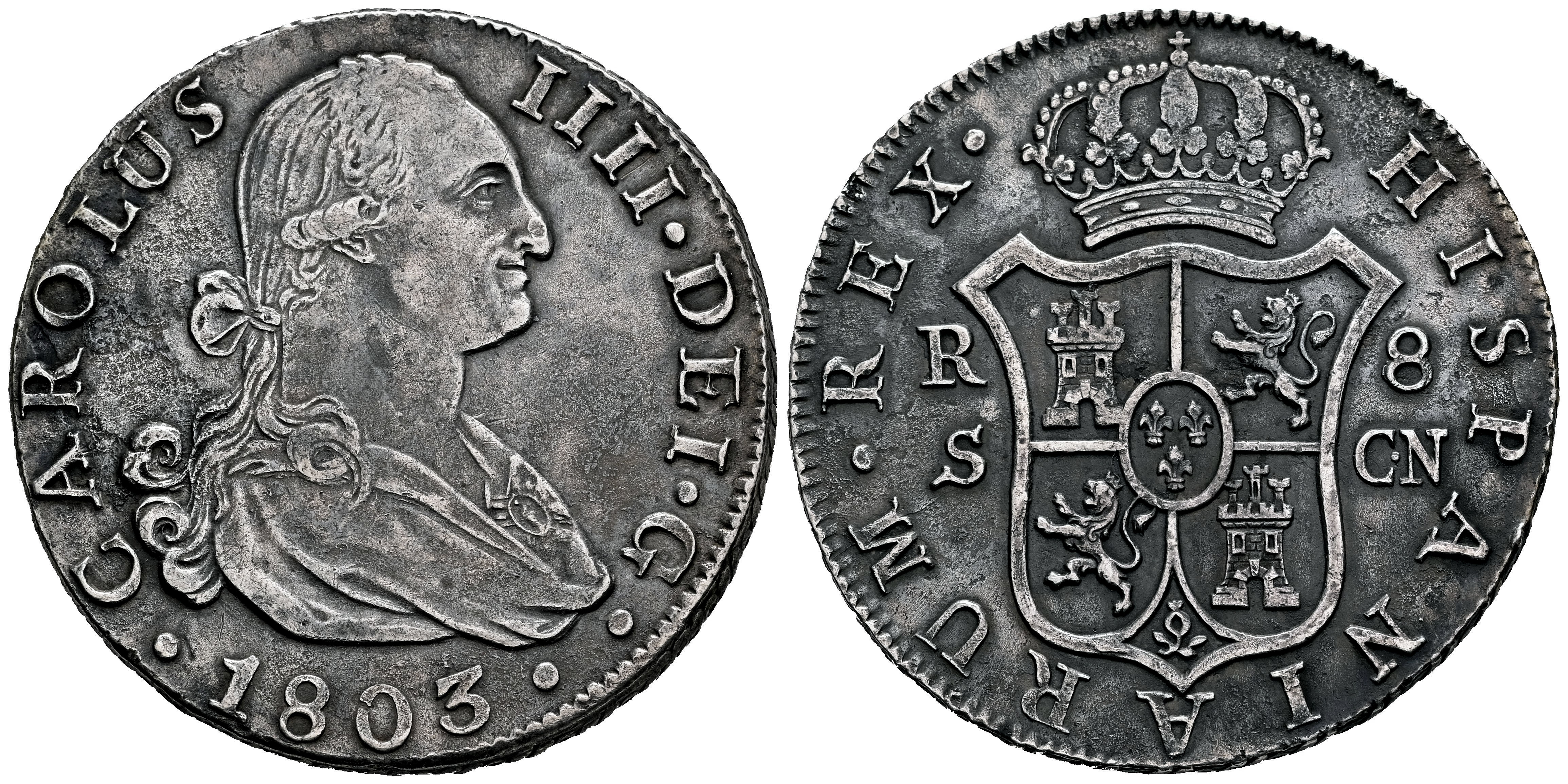 Charles IV (1788-1808). 8 reales. 1803. Sevilla. CN. (Cal-1065). Ag. 26,86 g. Rust. Patina. Scarce. VF. Est...250,00.
