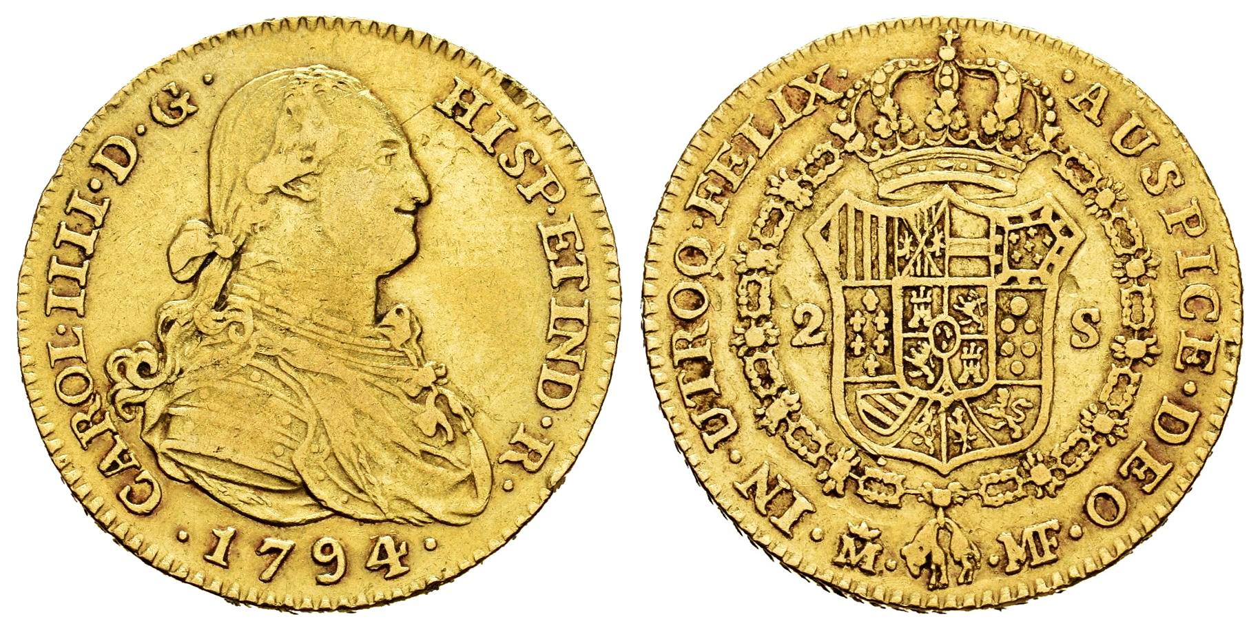 Charles IV (1788-1808). 2 escudos. 1794. Madrid. MF. (Cal-1282). Au. 6,79 g. Minor nicks on edge. Cleaned. Almost VF. Est...600,00.