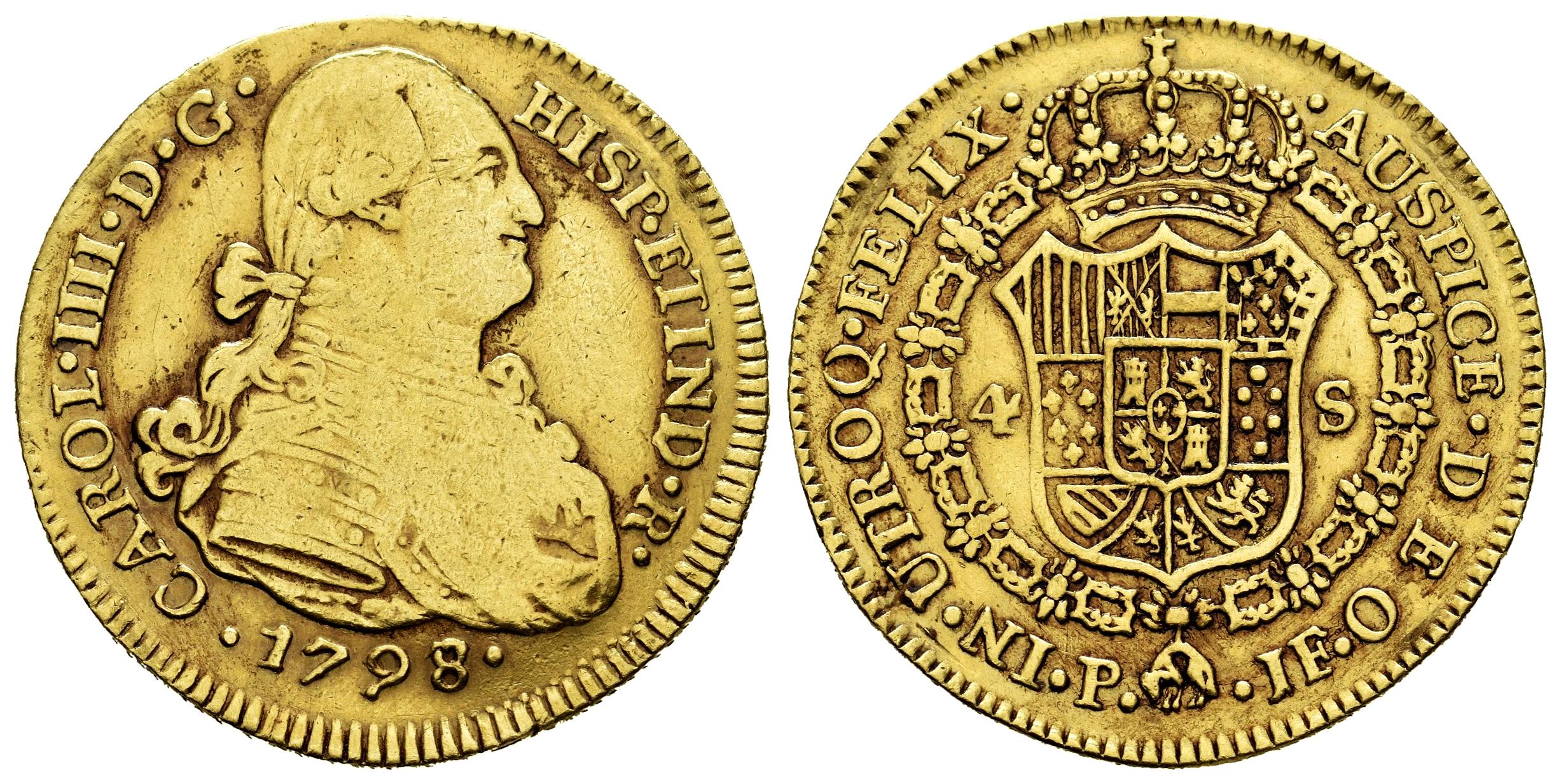 Charles IV (1788-1808). 4 escudos. 1798/7. Popayan. JF. (Cal-1516). Au. 13,38 g. Overdate. Removed from jewelry. Scarce. Choice F/Almost VF. Est...1500,00.