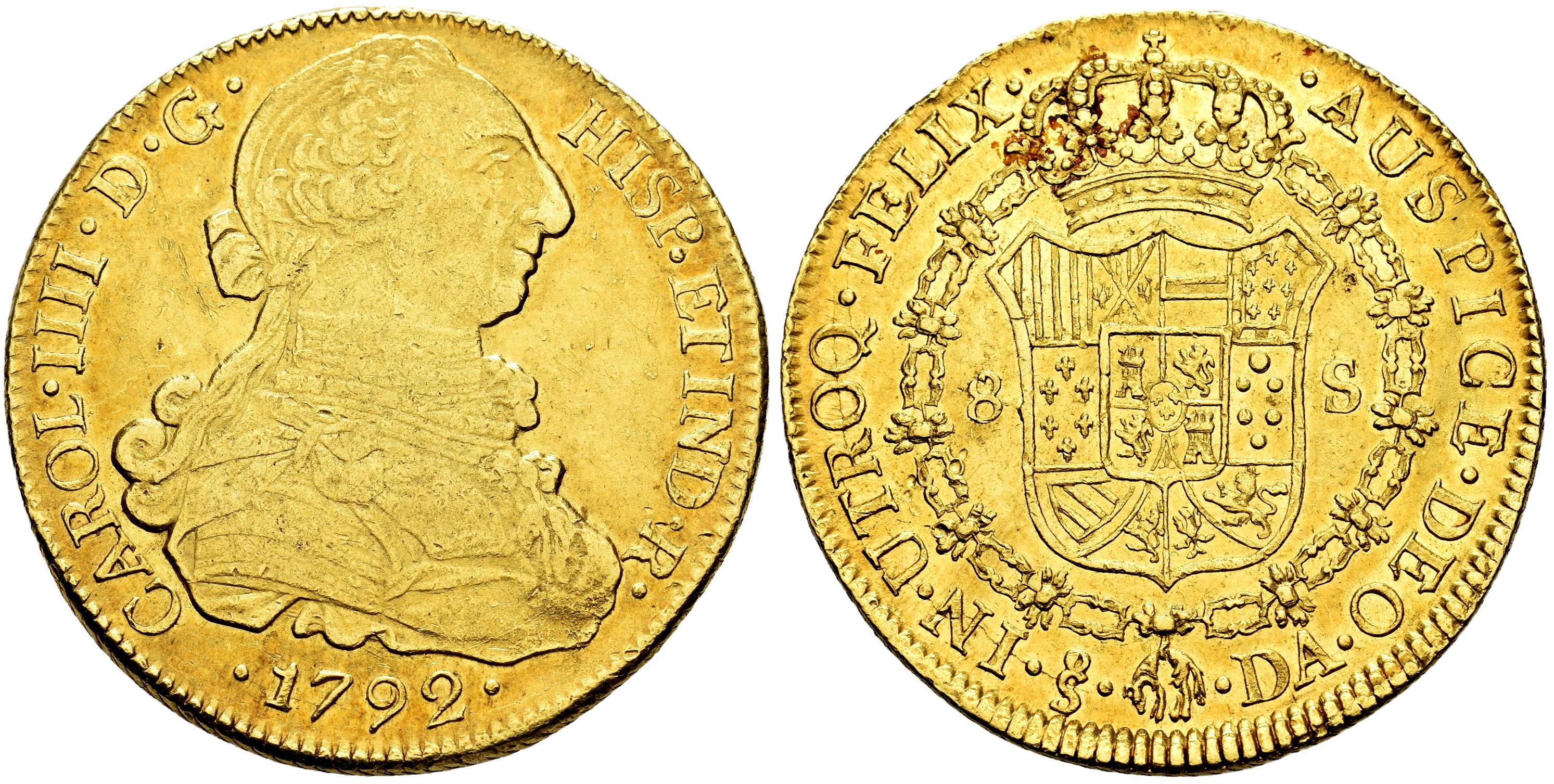 Charles IV (1788-1808). 8 escudos. 1792. Santiago. DA. (Cal-1757). (Cal onza-1156). Au. 27,02 g. Bust of Charles III and ordinal of king IIII. Faint scratches. Nice color. Original luster, even more in the reverse. Almost XF/XF. Est...3200,00.