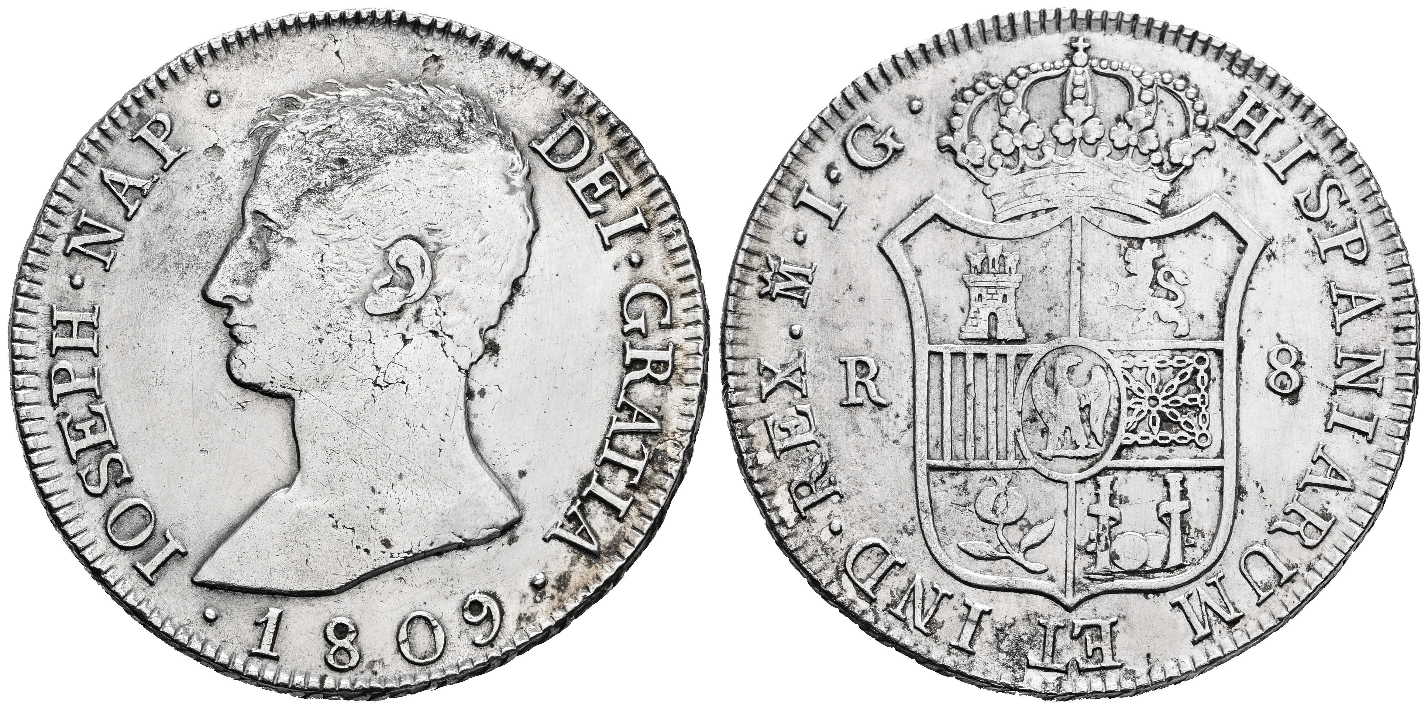 Joseph Napoleon (1808-1814). 8 reales. 1809. Madrid. IG. (Cal-33). Ag. 26,92 g. Harsly cleaned. Scarce. Almost VF/VF. Est...300,00.