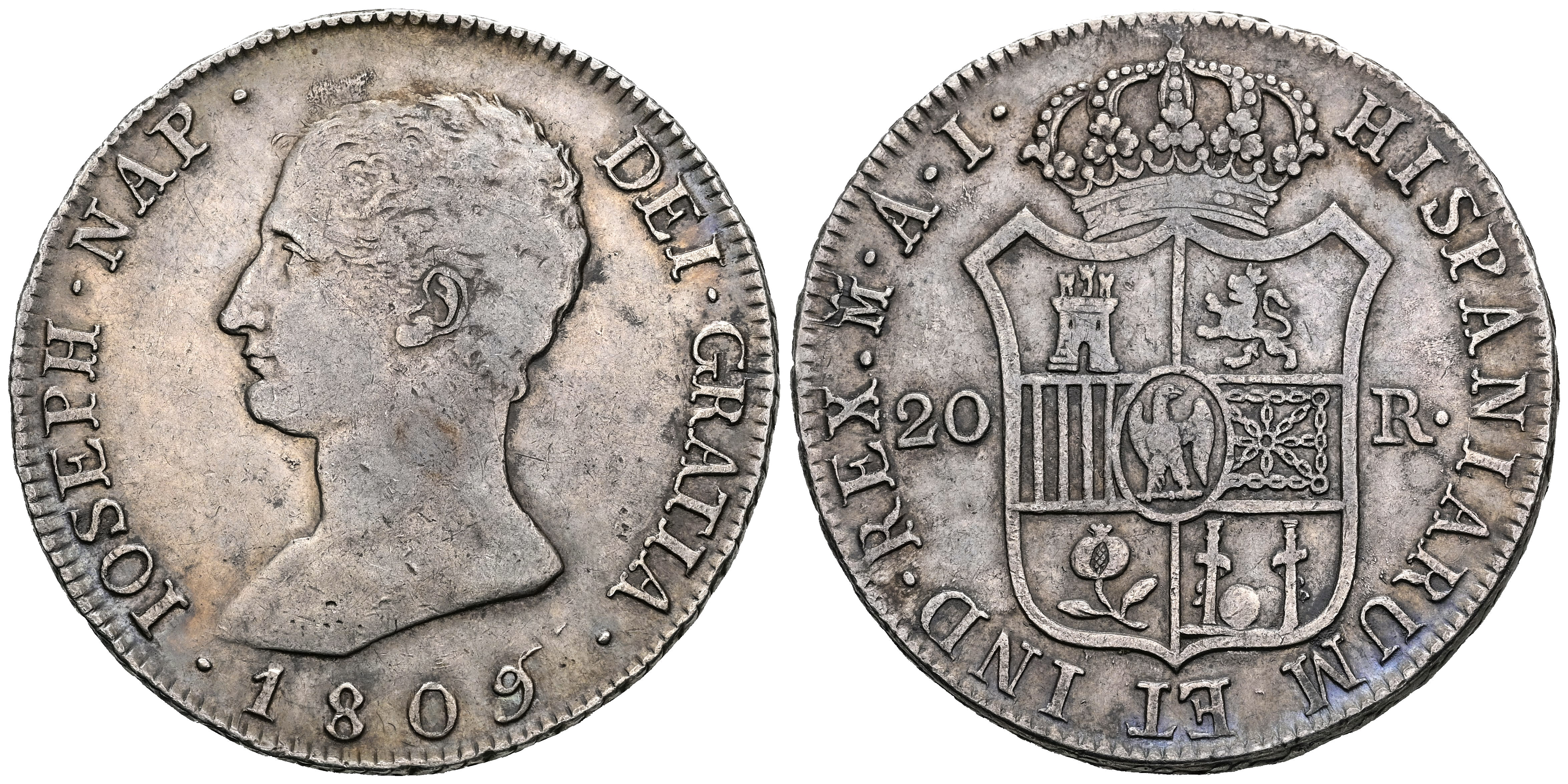 Joseph Napoleon (1808-1814). 20 reales. 1809. Madrid. AI. (Cal-36). Ag. 26,96 g. Patina. VF. Est...300,00.