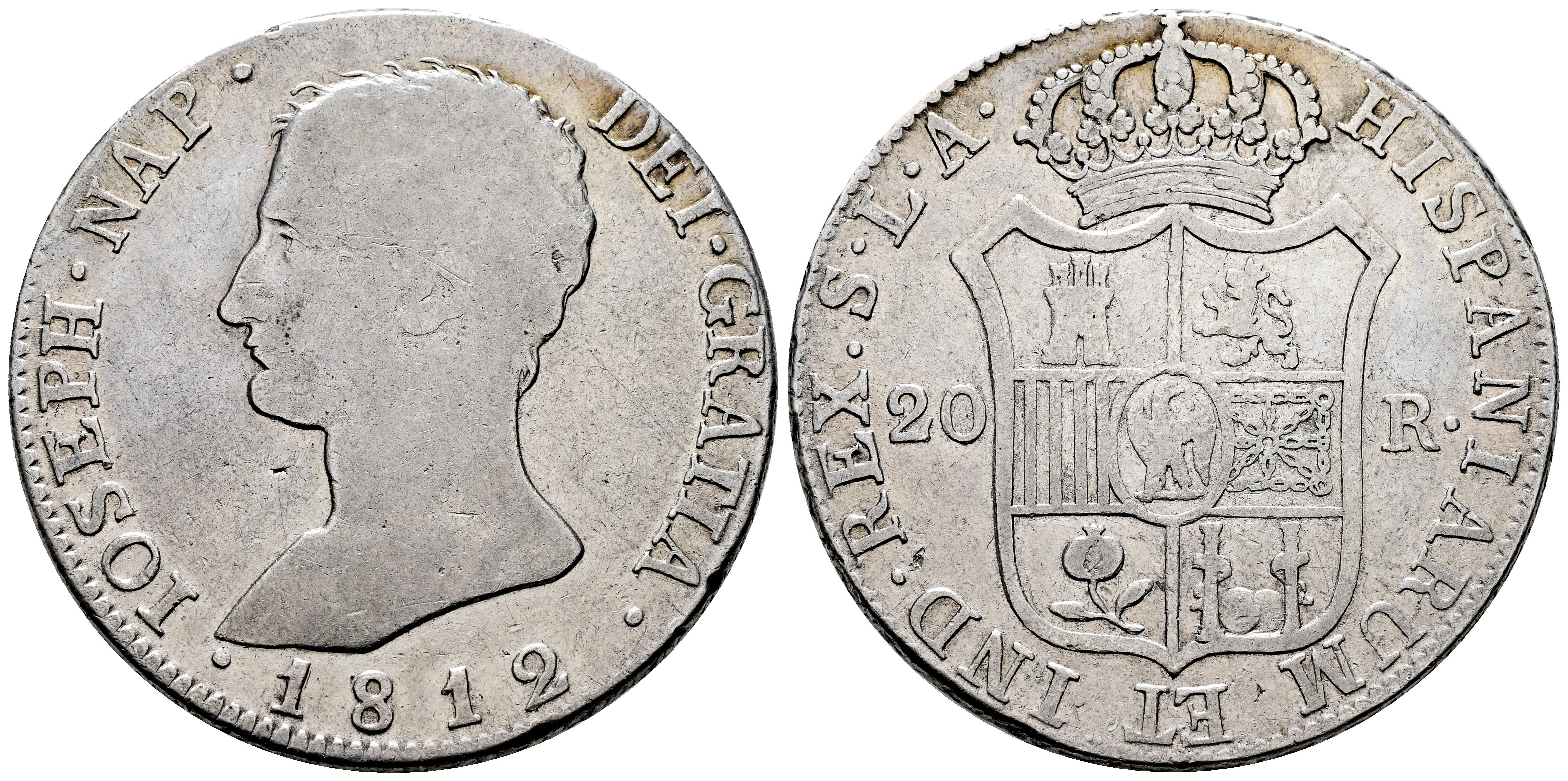 Joseph Napoleon (1808-1814). 20 reales. 1812. Sevilla. LA. (Cal-45). Ag. 26,98 g. Scarce. Ex Martí Hervera, November 2007, lot 624. Ex José Octavio Busto Collection. Retains the collector’s label. Choice F. Est...250,00.