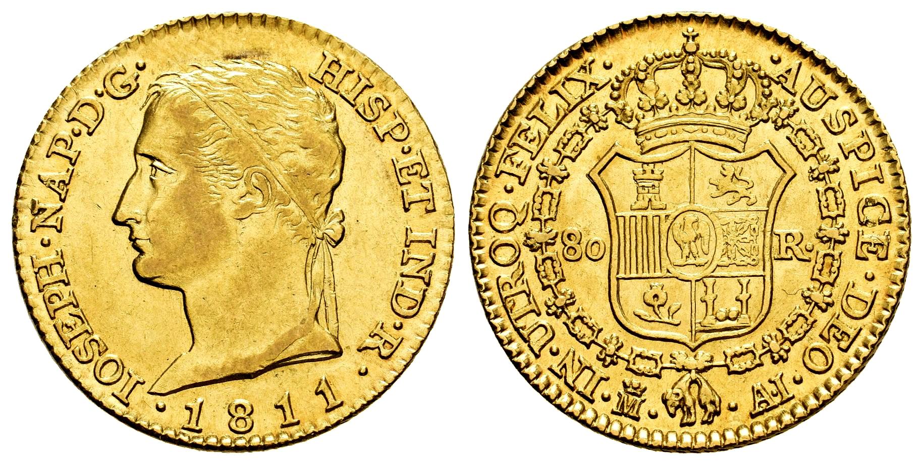Joseph Napoleon (1808-1814). 80 reales. 1811. Madrid. AI. (Cal-49). Au. 6,74 g. Diademed bust. Original luster. Rare, even more so in this grade. AU. Est...2500,00.