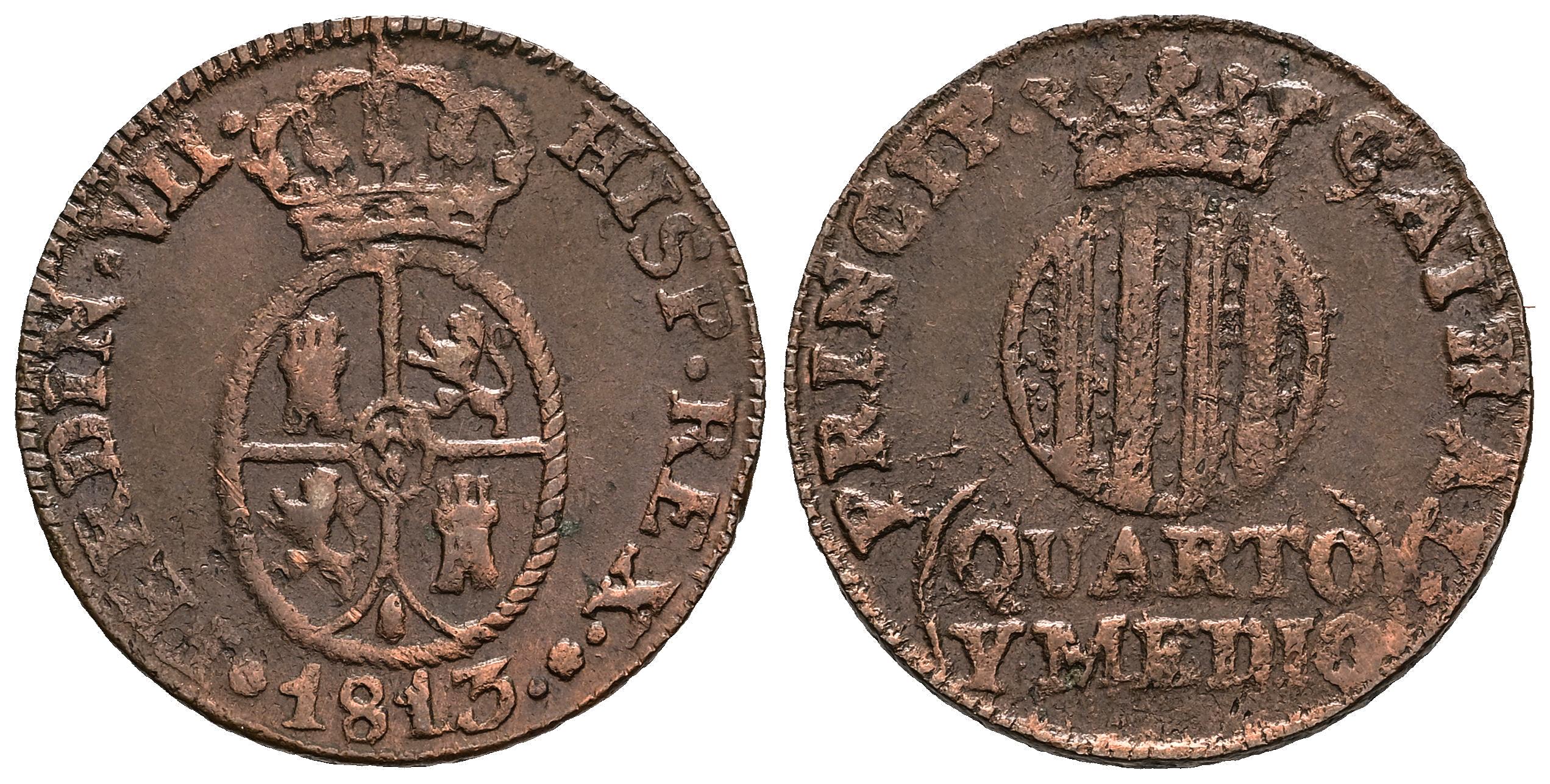 Ferdinand VII (1808-1833). 1 Quarter and a half. 1813. Cataluña, minted in Mallorca. (Cal-6). Ae. 3,45 g. VF. Est...50,00.