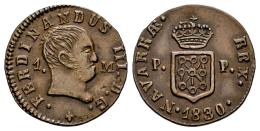 Ferdinand VII (1808-1833). 1 maravedi. 1830. Pamplona. (Cal-39). (Ros-4.11.28). Ae. 1,64 g. Bare bust. A good sample. Scarce in this grade. XF. Est...100,00.