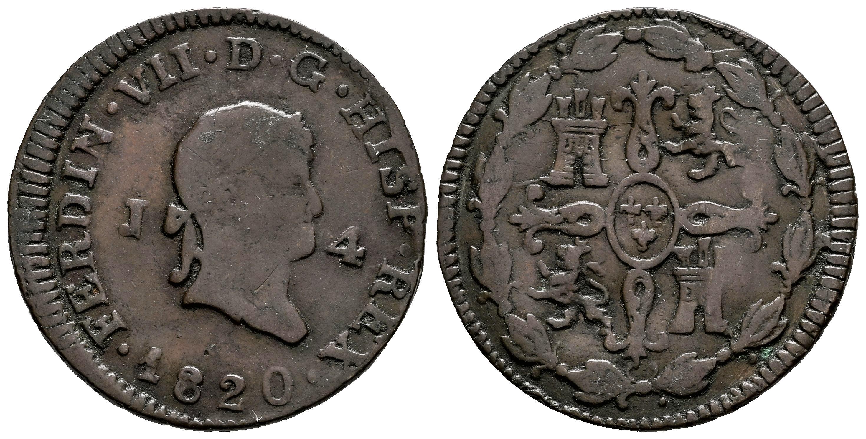 Ferdinand VII (1808-1833). 4 maravedis. 1820. Jubia. (Cal-166). Ae. 4,66 g. Laureate bust. Rare. Almost VF. Est...180,00.