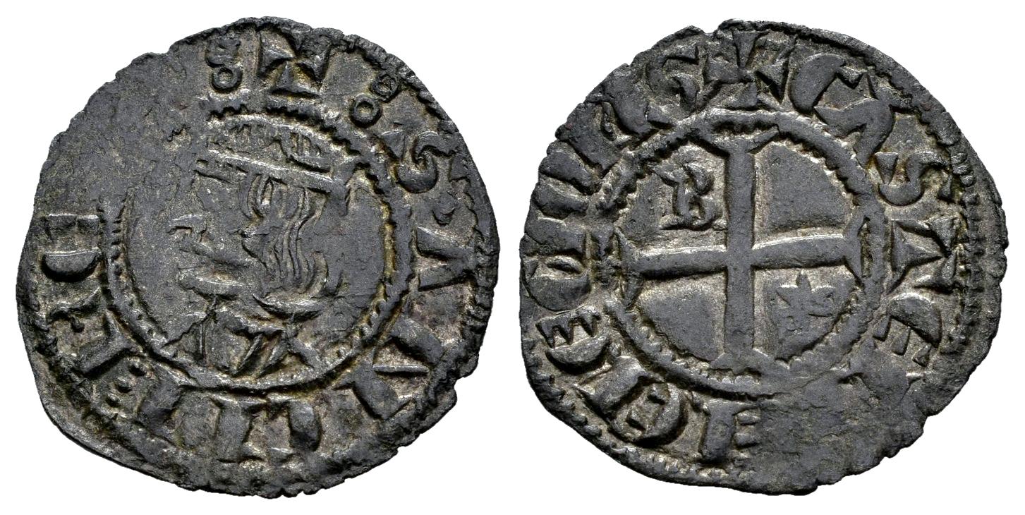 Kingdom of Castille and Leon. Sancho IV (1284-1295). Seisen or Meaja Coronada. Burgos. (Bautista-440 var.). Anv.: + : SANCII︙REX :. Bi. 0,75 g. B in the 1st quadrant and star in the 4th quadrant. Choice VF. Est...50,00.