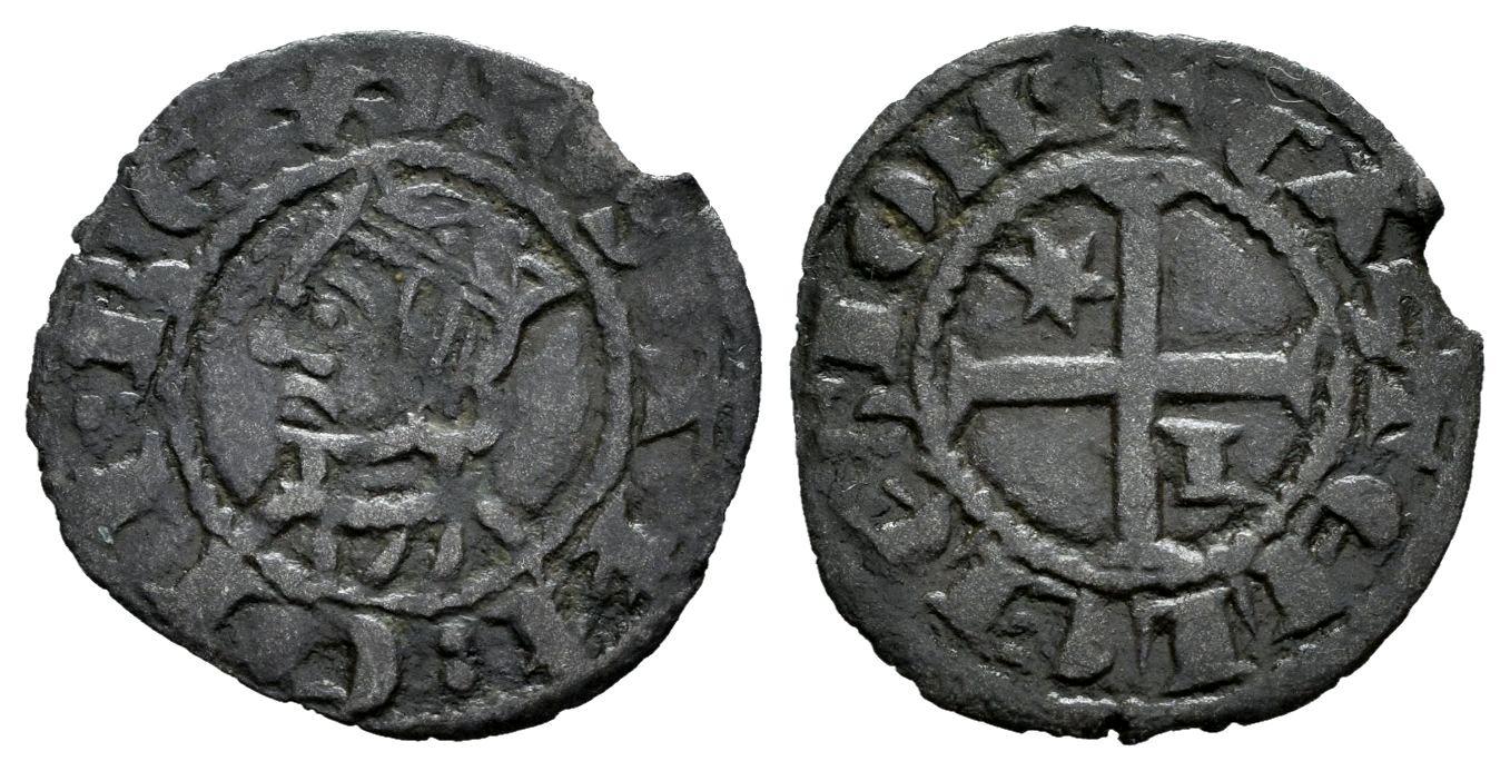 Kingdom of Castille and Leon. Sancho IV (1284-1295). Seisen or Meaja Coronada. Leon. (Bautista-443.1). Anv.: + SAИC : CII : REX . Bi. 0,67 g. Star and L in the second and third quadrants. Slight planchet break. Patina. Choice VF. Est...45,00.