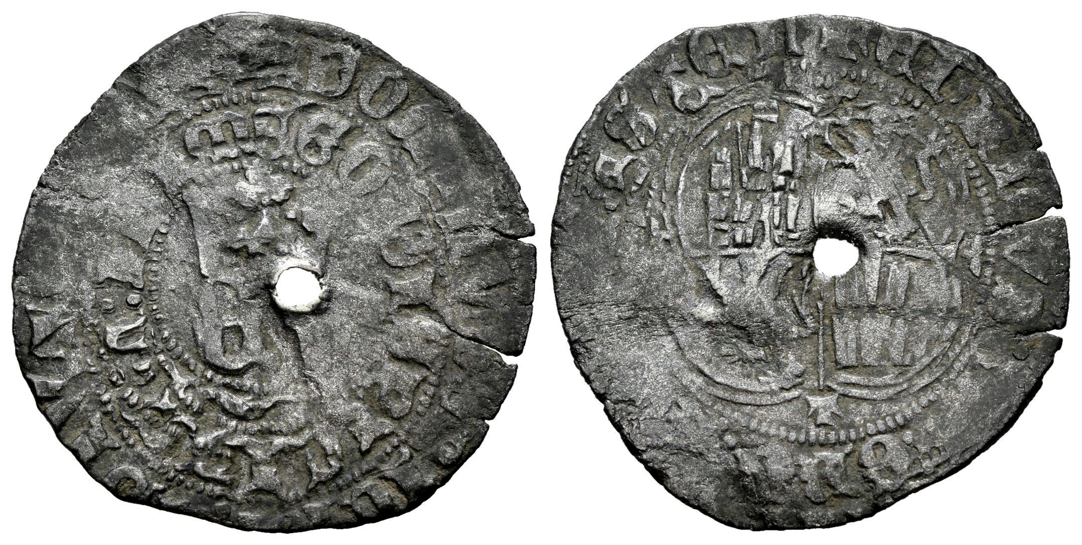 Kingdom of Castille and Leon. Enrique II (1368-1379). Real de vellon. Toledo. (Bautista-583). Bi. 2,72 g. T bajo el cuartelado y adornos en los extremos. Perforación central. Choice F. Est...20,00.