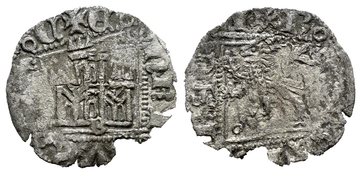 Kingdom of Castille and Leon. Enrique II (1368-1379). Noven. Burgos. (Bautista-679.1). Bi. 0,47 g. B bajo el castillo, roel bajo el león. Doble acuñación. Cospel faltado. Choice F. Est...10,00.