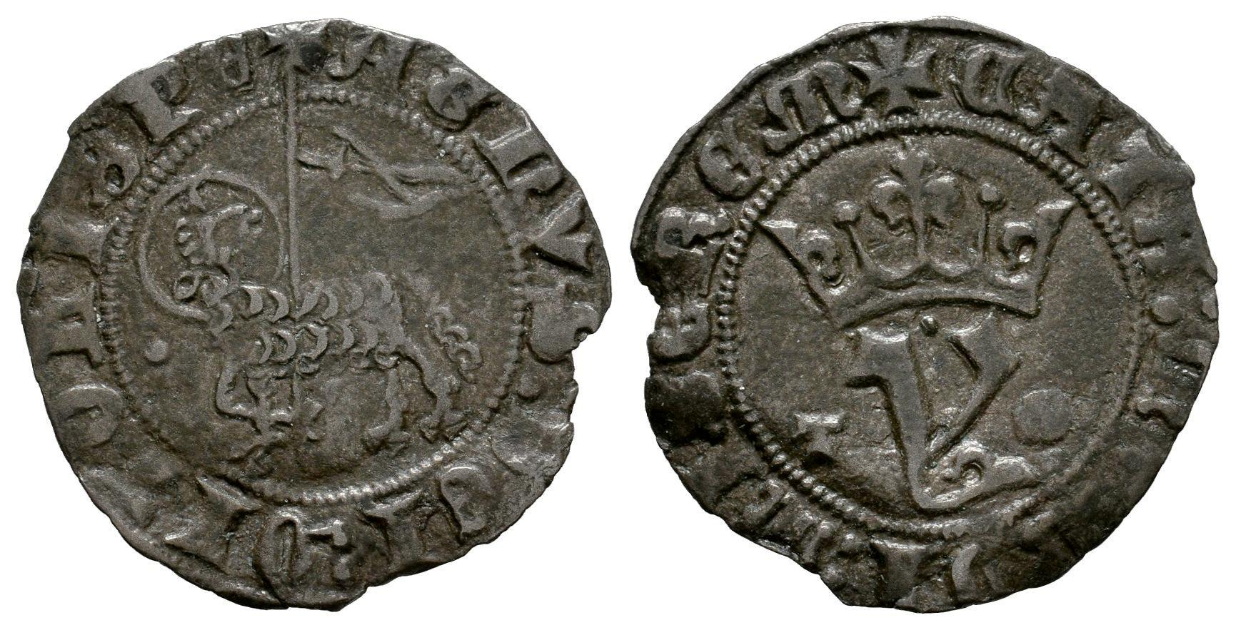 Kingdom of Castille and Leon. Juan I (1379-1390). Blanca del Agnus Dei. Toledo. (Bautista-731.2). (Abm-557.2). Anv.: + AGNVS : DEI : QVITOLIS PE. Rev.: + CATA : MVNDI : MISEREM. Bi. 1,20 g. Pellet in front of the lamb; T and O on the sides of the crowned Y. Slight wavy flan. Patina. Choice VF. Est...50,00.