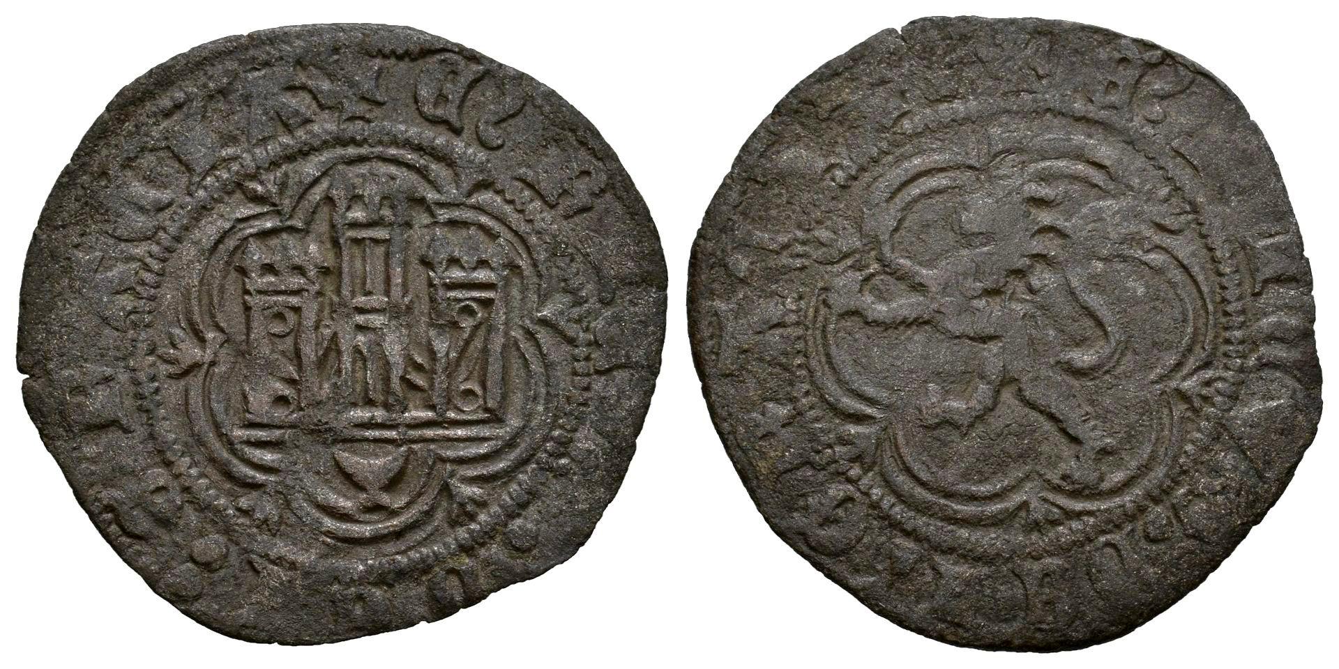 Kingdom of Castille and Leon. Enrique III (1390-1406). Blanca. Cuenca. (Bautista-768). (Abm-600). Anv.: + ENRICVS : DEI : GRACIA. Rev.: + ENRICVS : DEI : GRACIA : . Bi. 1,50 g. Bowl below castle. Same legend on obverse and reverse. VF. Est...25,00.