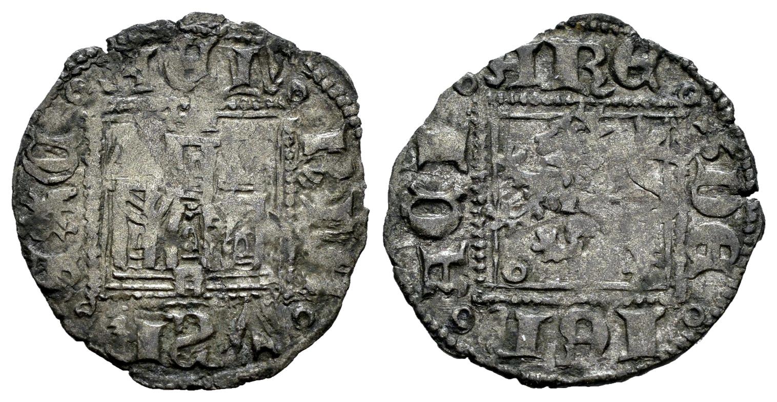 Kingdom of Castille and Leon. Enrique II (1368-1379). Noven. Burgos. (Bautista-679.2). Anv.: oAENo / oRICo/ oVSRo/ oEXCo. Rev.: oAREo / oXDEo / oIGRo/ oACIo. Bi. 0,74 g. With B below the castle and roundel before the lion. VF. Est...120,00.