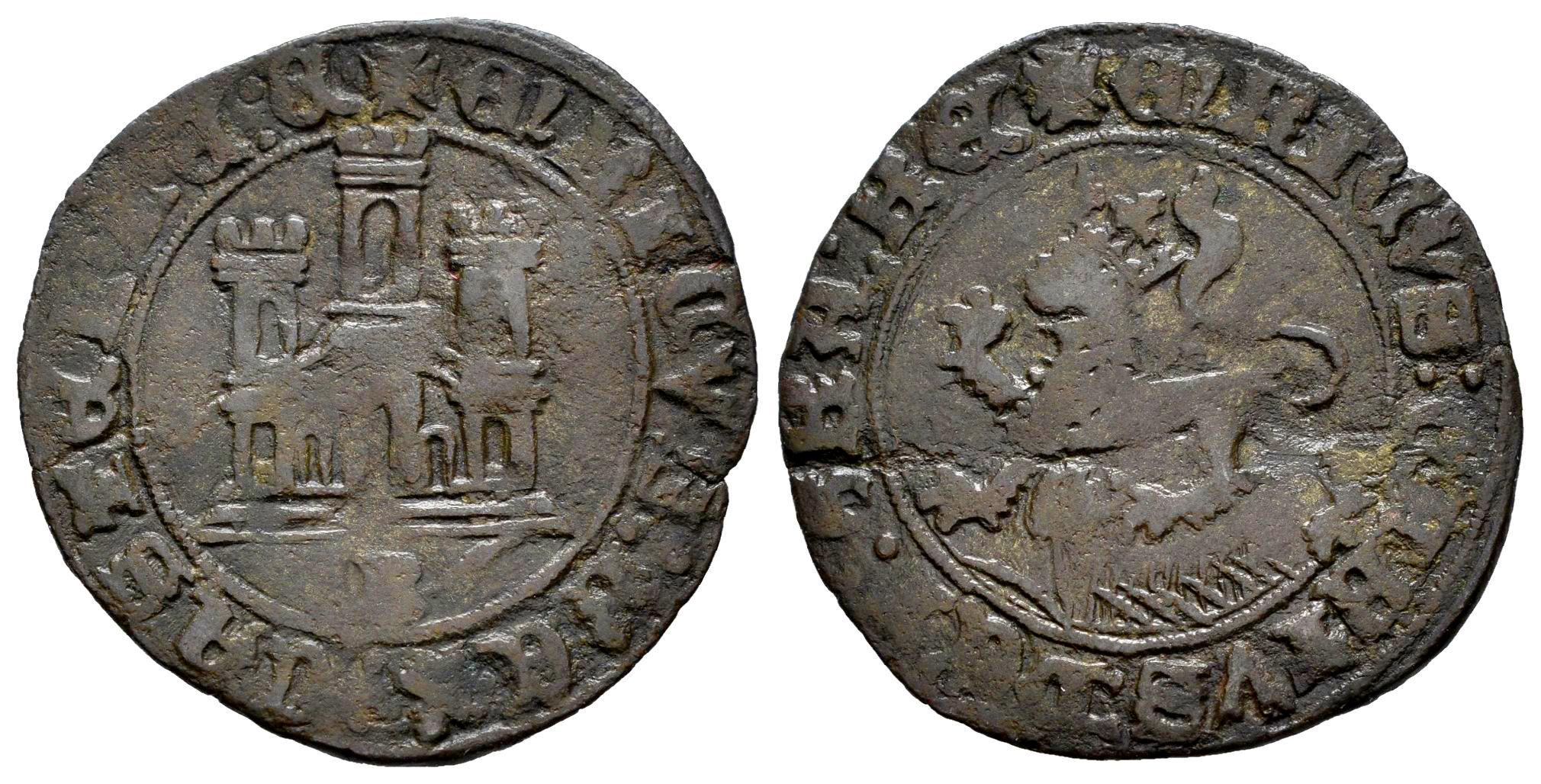 Kingdom of Castille and Leon. Enrique IV (1454-1474). 1 maravedi. Burgos. (Bautista-958.2 var.). Anv.: + ENRICVS : REX : CASTELLE : E. Rev.:  + ENRICVS : QVARTVS : DEI : GRA : RE. Bi. 2,35 g. B below castle. Unusual legends. Rare. Almost VF. Est...70,00.