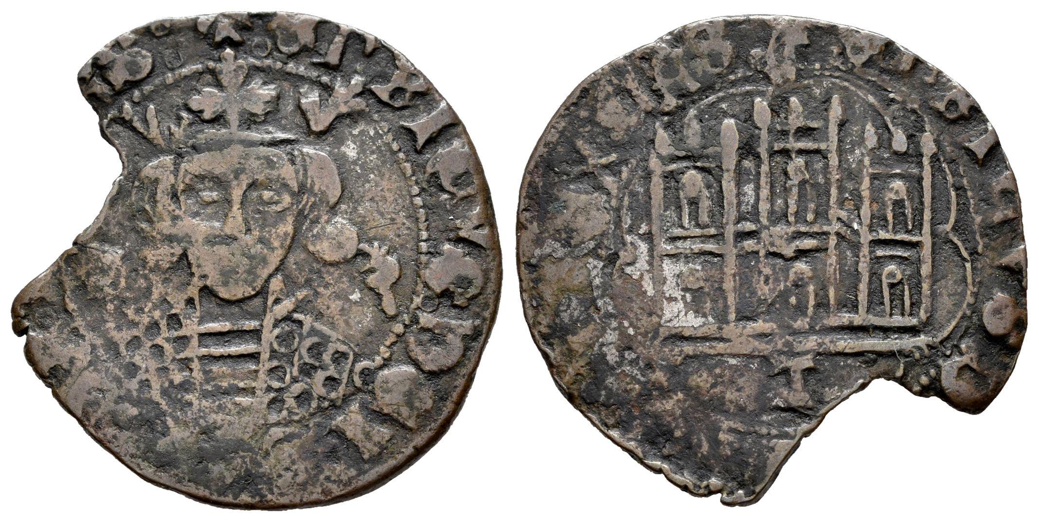 Kingdom of Castille and Leon. Enrique IV (1454-1474). Cuartillo. Toledo. (Bautista-1025.2 var.). Anv.: + : ENRICVS : DEI ... AS : . Rev.: + ENRICVS D ... EX CAS. Bi. 3,93 g. T below the castle. With floral ornaments on both sides of the bust. Contemporary counterfeit. Planchet break. Almost VF. Est...45,00.