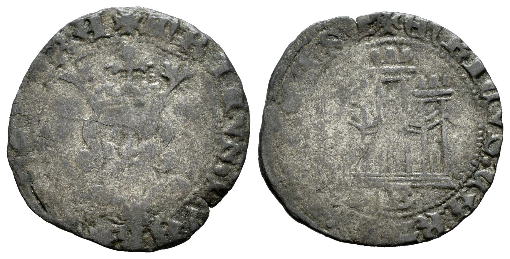 Kingdom of Castille and Leon. Enrique IV (1454-1474). 1/2 cuartillo. Burgos. (Bautista-1039 var.). Anv.: + ENRICVS : QVART(VS :) DEI : GRA. Rev.: + ENRICVS : CART ... CAS. Bi. 1,54 g. B below castle. F/Almost F. Est...30,00.