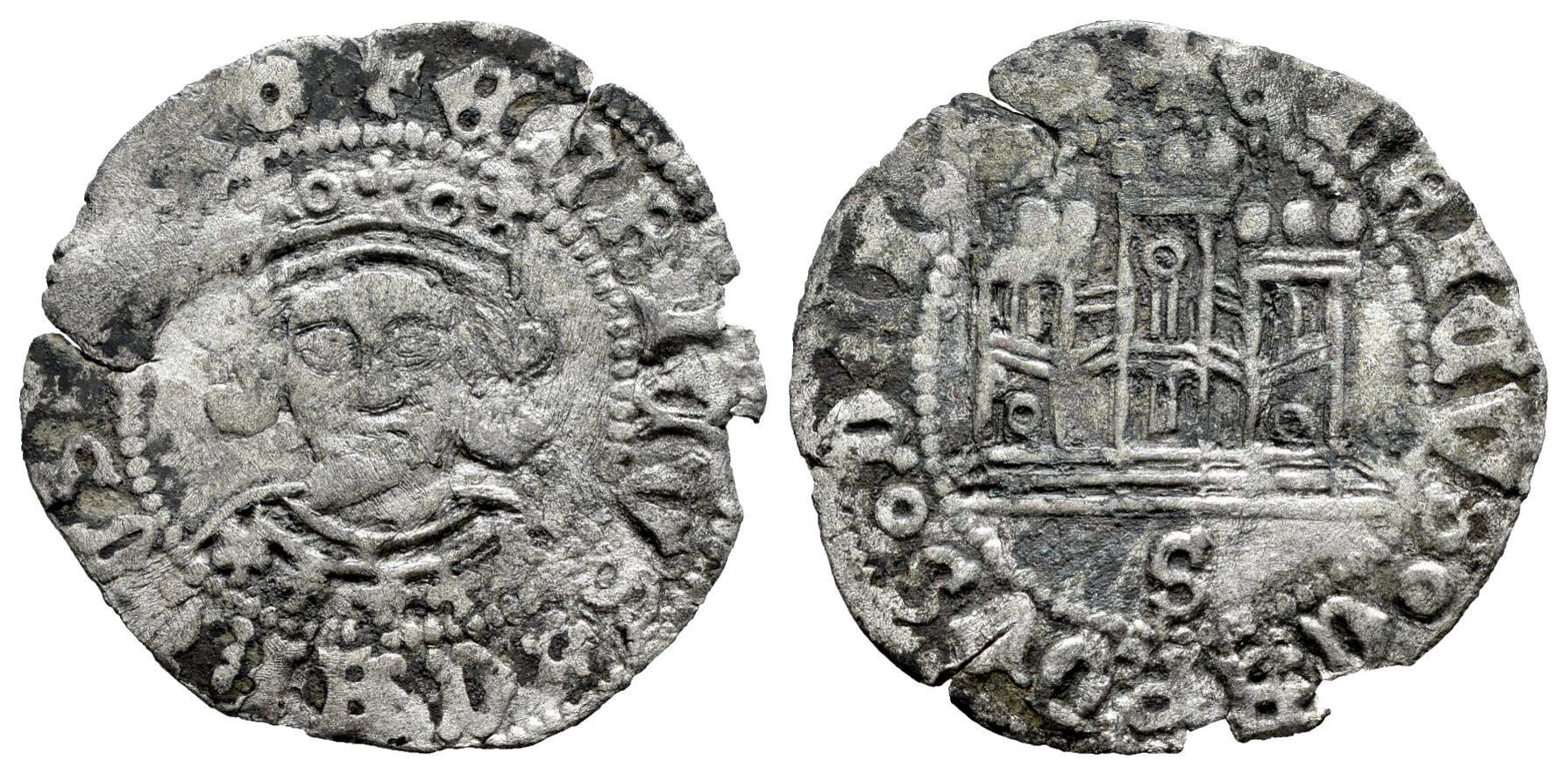 Kingdom of Castille and Leon. Enrique IV (1454-1474). 1/2 cuartillo. Sevilla. (Bautista-1054 var.). Anv.: + ENRICVS ✿ CARTVS ✿ REX ✿. Rev.: + ENRICVS ◦ CARTVS ◦ DEI ◦ GR. Bi. 1,14 g. S below the castle. Scarce. VF. Est...65,00.
