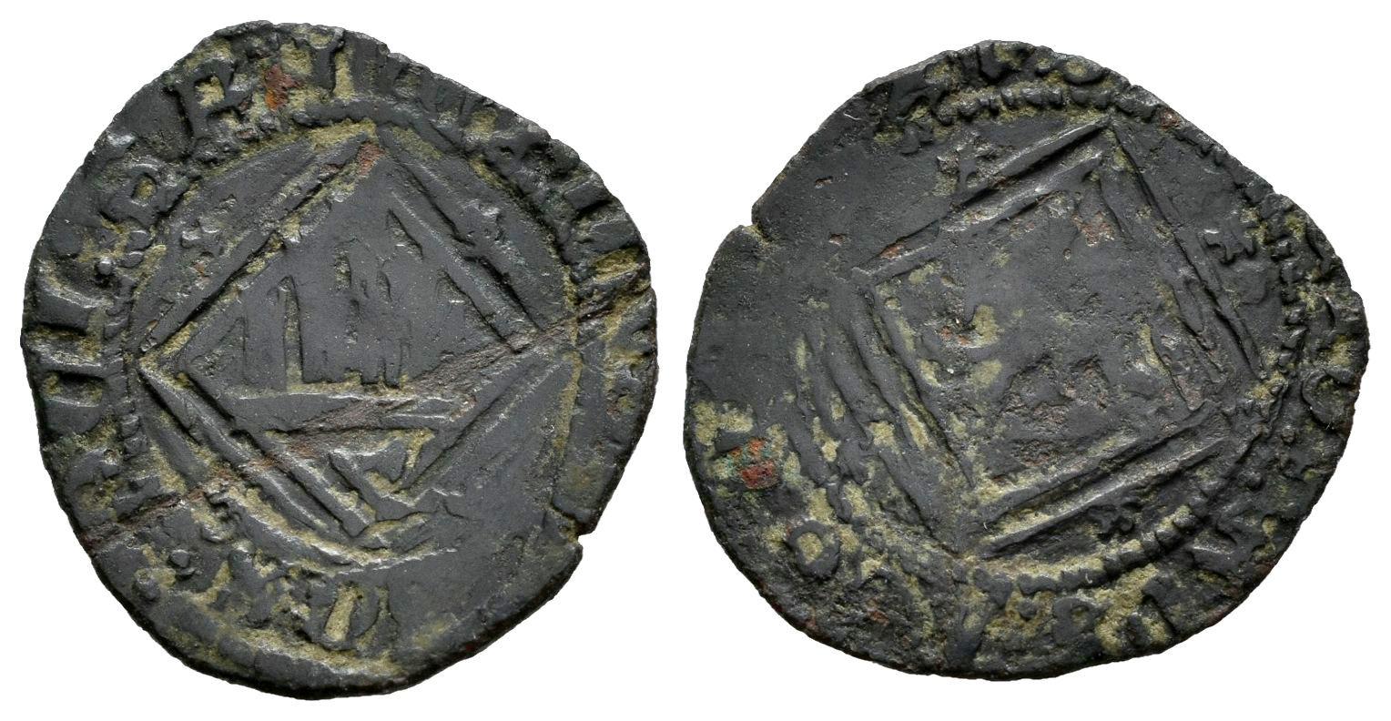 Kingdom of Castille and Leon. Enrique IV (1454-1474). Blanca de rombo. Toledo. (Bautista-1085 var.). Anv.: + ENRICVS : DEI : GR. Rev.: (+ XPS : VINC)IT : I : XPS : REG. Bi. 1,13 g. T below the castle. Blades decorating the fields. Bend. F/Choice F. Est...25,00.